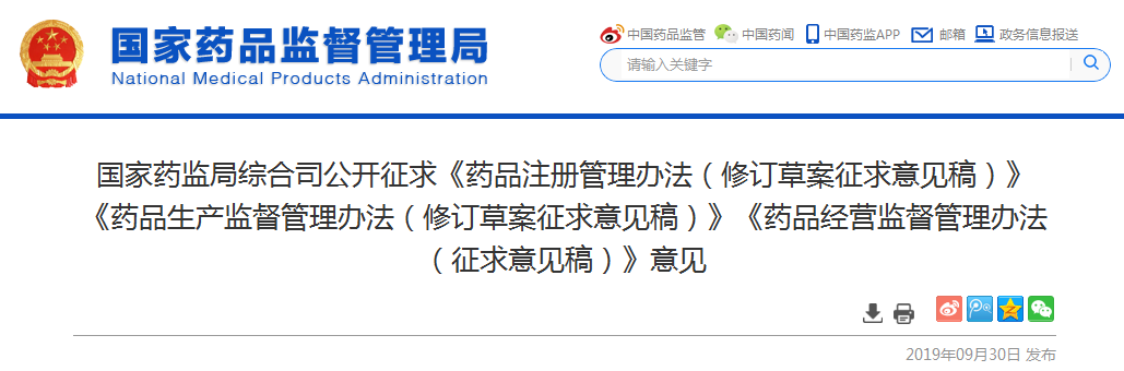 國家藥監局綜合司公開征求《藥品注冊管理辦法(修訂草案征求意見稿)》《藥品生產監督管理辦法(修訂草案征求意見稿)》《藥品經營監督管理辦法(征求意見稿)》意見