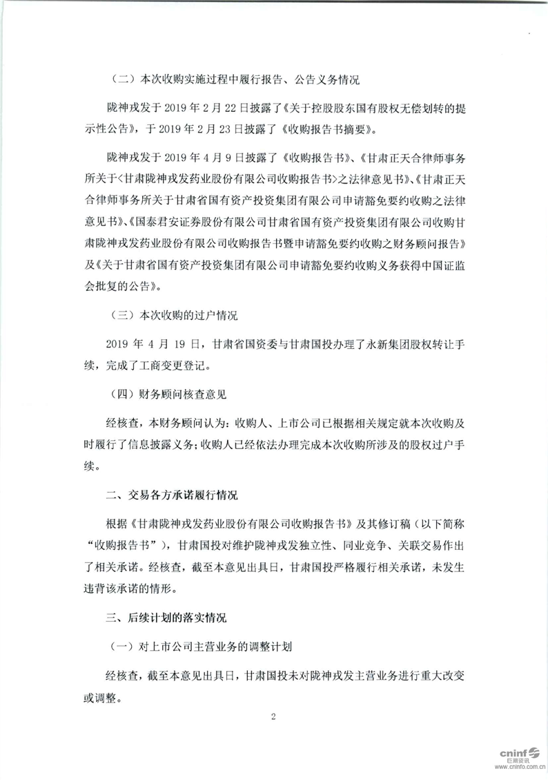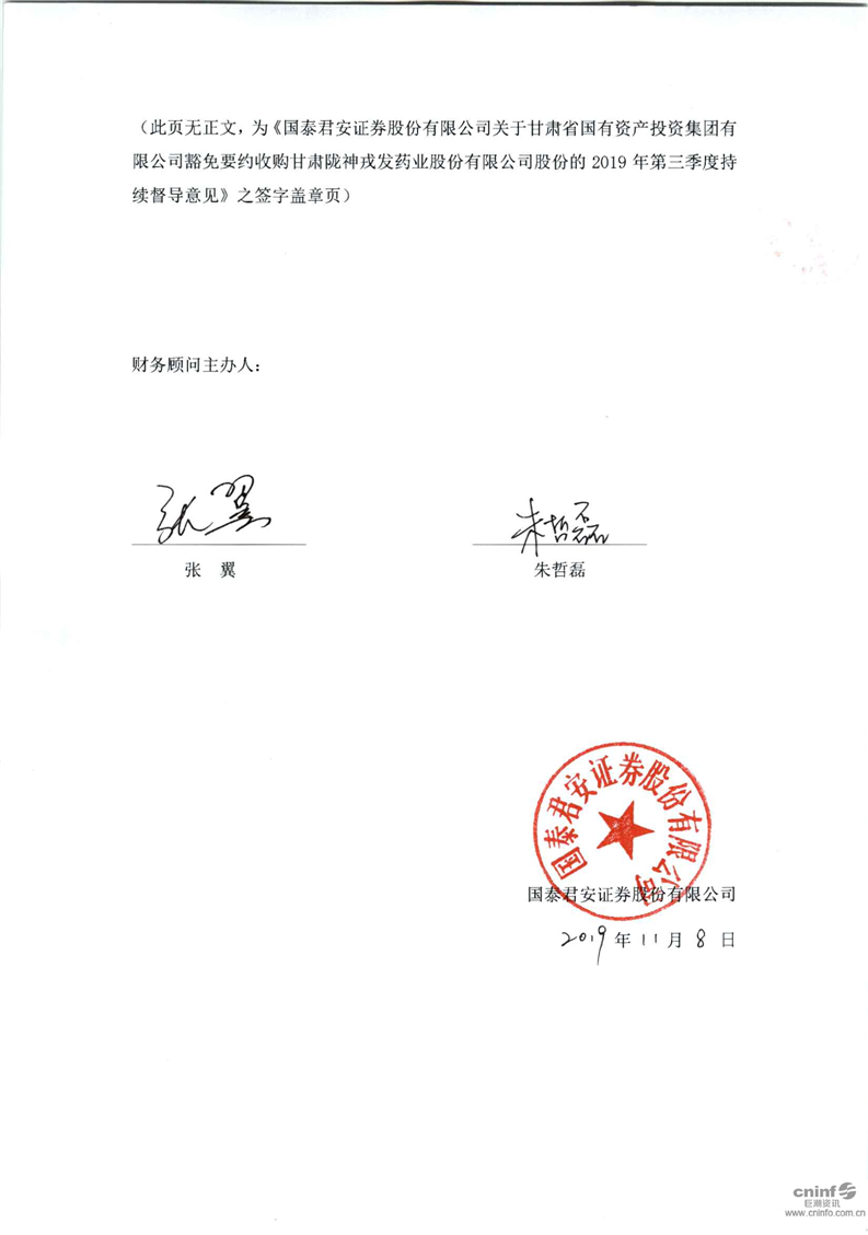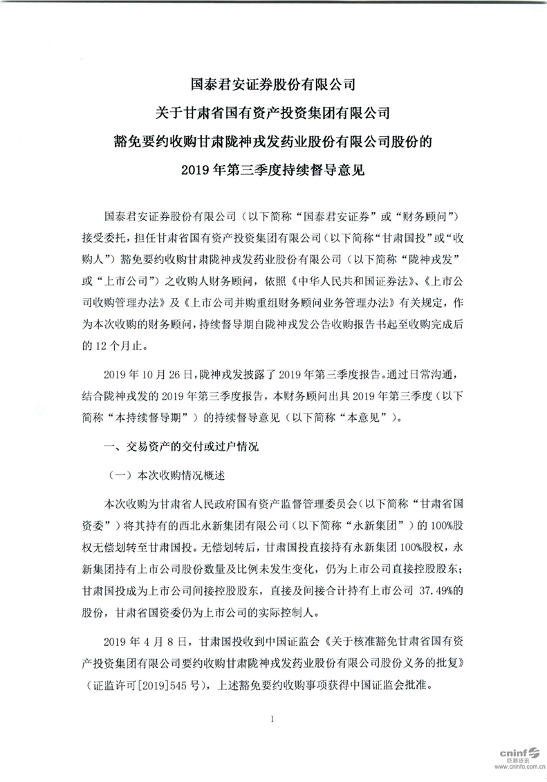 國泰君安證券股份有限公司關于甘肅省國有資產投資集團有限公司豁免要約收購公司股份的2019年第三季度持續督導意見