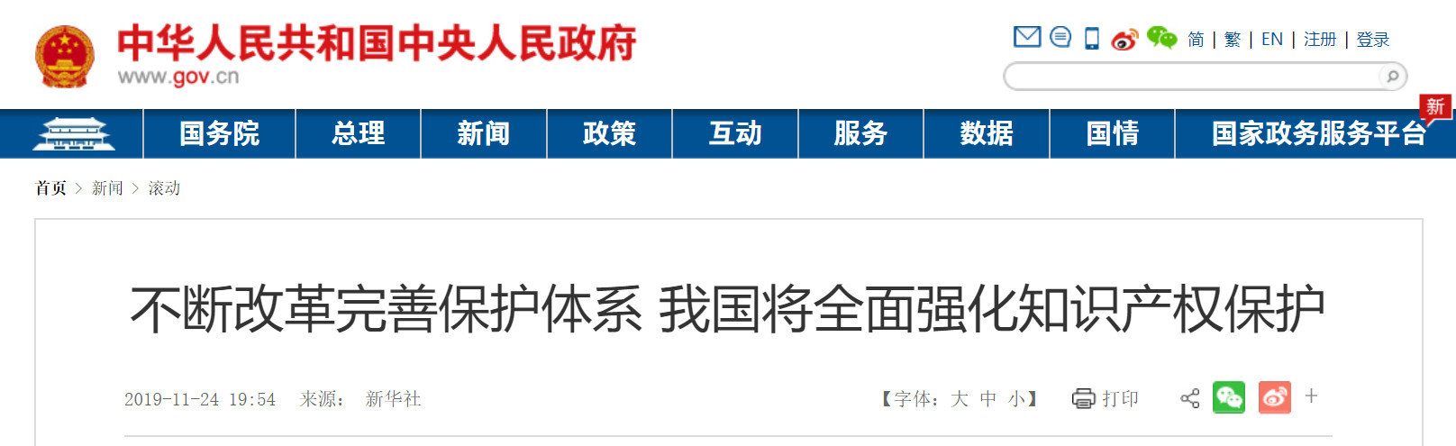 新華社北京11月24日電(記者 張泉)近日,中共中央辦公廳、國務(wù)院辦公廳印發(fā)《關(guān)于強(qiáng)化知識(shí)產(chǎn)權(quán)保護(hù)的意見》,明確要不斷改革完善知識(shí)產(chǎn)權(quán)保護(hù)體系,綜合運(yùn)用法律、行政、經(jīng)濟(jì)、技術(shù)、社會(huì)治理手段強(qiáng)化保護(hù),促進(jìn)保護(hù)能力和水平整體提升。