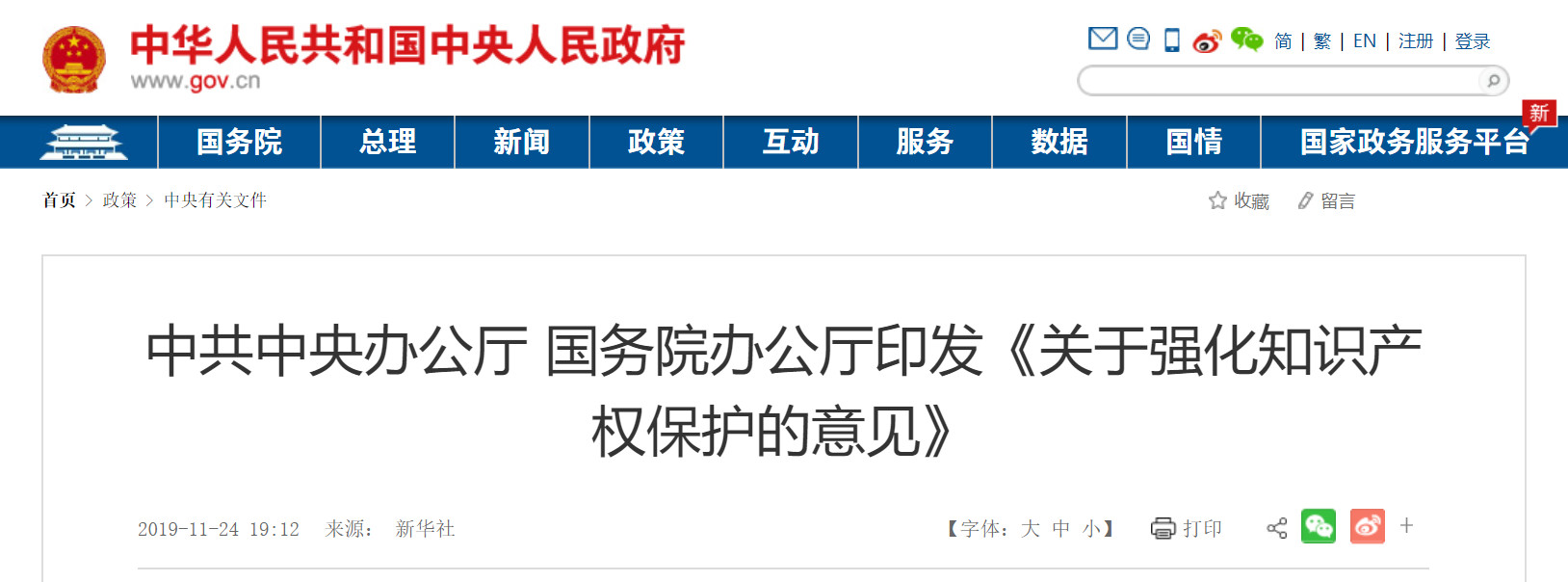 新華社北京11月24日電 近日,中共中央辦公廳、國務(wù)院辦公廳印發(fā)了《關(guān)于強(qiáng)化知識(shí)產(chǎn)權(quán)保護(hù)的意見》,并發(fā)出通知,要求各地區(qū)各部門結(jié)合實(shí)際認(rèn)真貫徹落實(shí)。