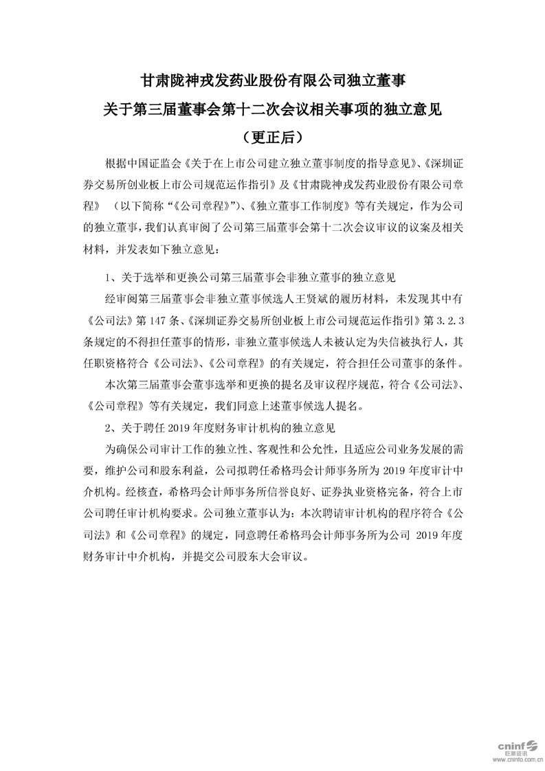 獨立董事關(guān)于第三屆董事會第十二次會議相關(guān)事項的獨立意見(更新后)