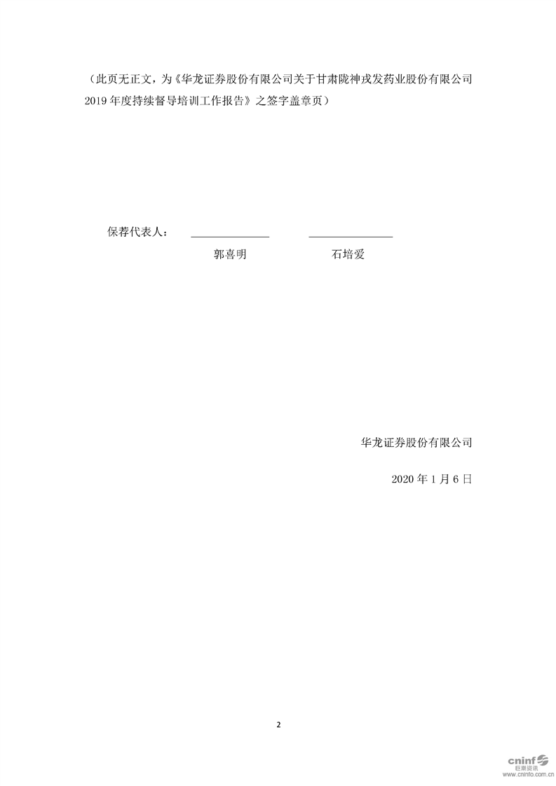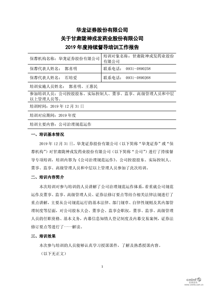 華龍證券股份有限公司關于公司2019年度持續督導培訓工作報告