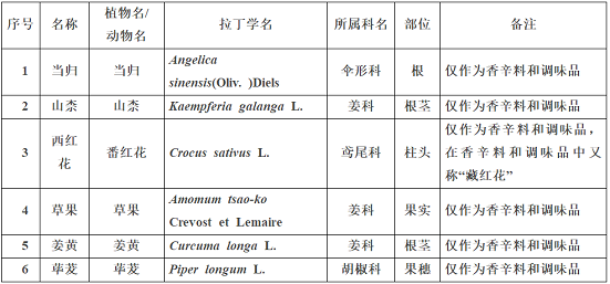 山柰、西紅花、草果、姜黃、蓽茇。在《中國藥典》(2015年版)收載。我國傳統(tǒng)將山柰、西紅花、草果、姜黃、蓽茇作為香辛料和調(diào)味品食用,且列入《香辛料和調(diào)味品 名稱》(GB/T 12729.1-2008)。在食藥物質(zhì)目錄中所列的基源植物和食用部分與《中國藥典》記載一致。