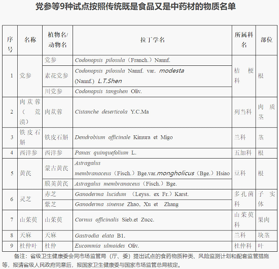 關(guān)于對(duì)黨參等9種物質(zhì)開展按照傳統(tǒng)既是食品又是中藥材的物質(zhì)管理試點(diǎn)工作的通知