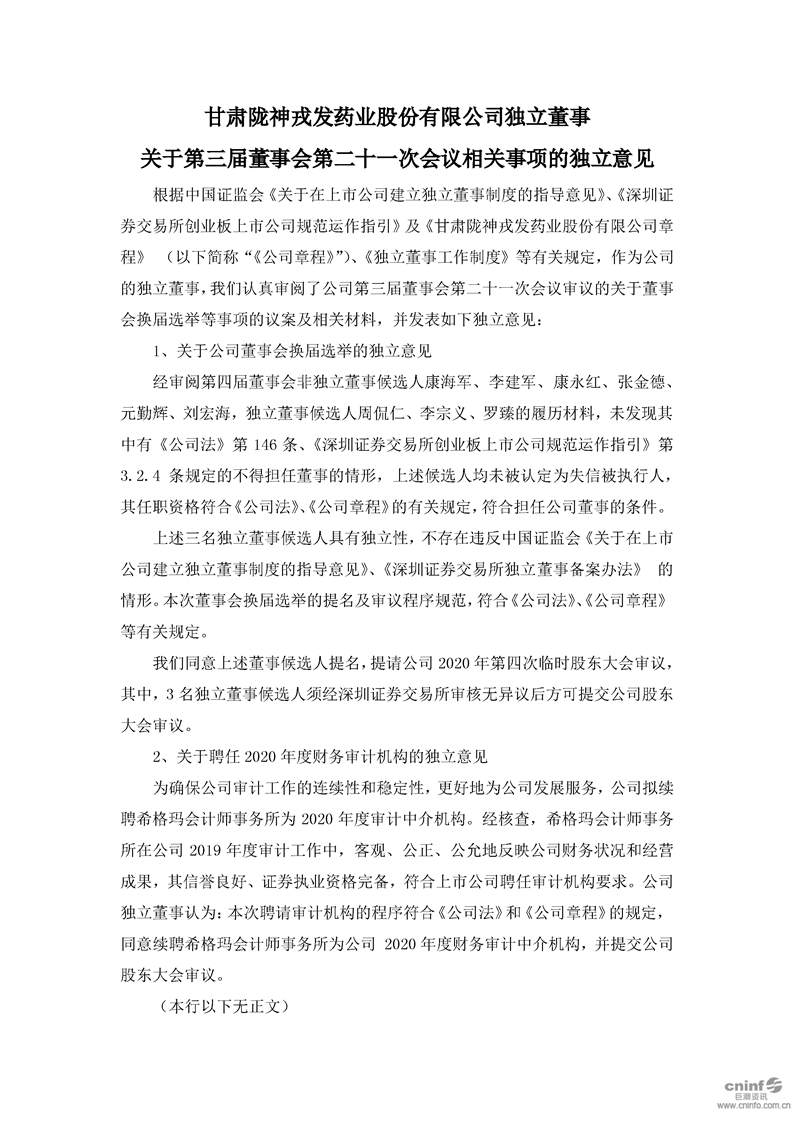 獨立董事關于第三屆董事會第二十一次會議相關事項的獨立意見
