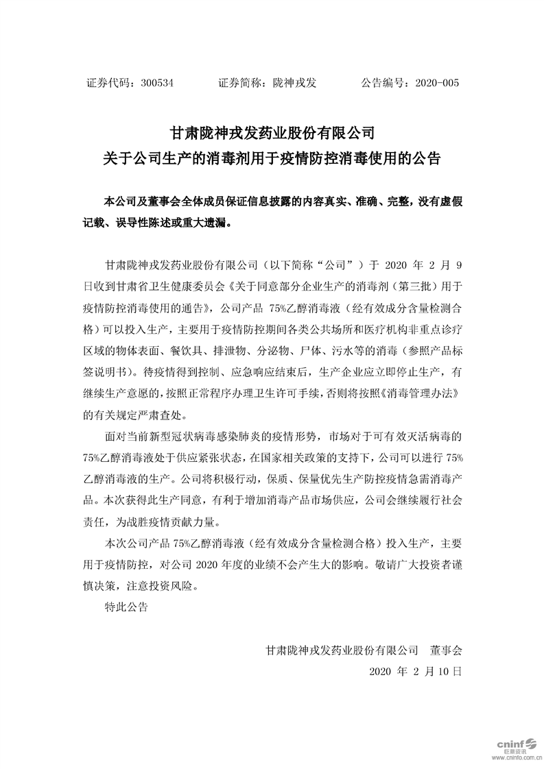 關于公司生產的消毒劑用于疫情防控消毒使用的公告