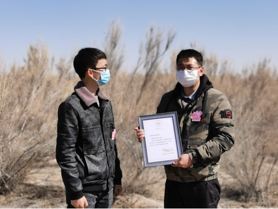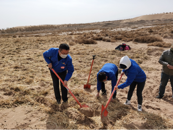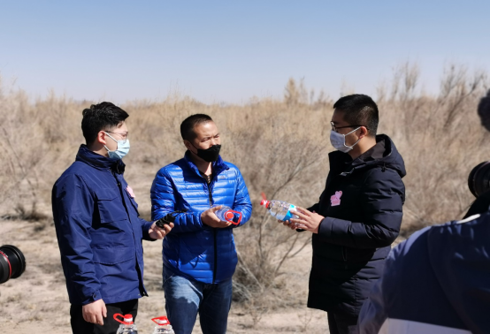 2020年3月16日,甘肅隴神戎發藥業股份有限公司志愿者一行4人與甘肅衛視《好人在身邊》欄目組驅車400多公里,來到位于甘肅省武威市民勤縣的騰格里沙漠最西端,在一望無際的沙漠戈壁中學習打草格、種梭梭樹,感受了治沙志愿者為民勤的治沙事業所付出的艱辛勞動。公司副總經理錢雙喜代表隴神戎發為“青梭公益”的志愿者捐贈公司生產的75%的乙醇消毒液,用于治沙志愿者在治沙過程中人員和器皿的消毒。