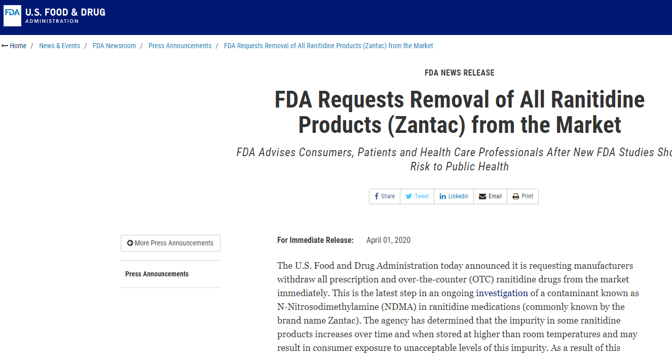 突發(fā)!FDA要求所有藥企立即下架雷尼替丁,因含致癌的亞硝酸胺雜質(zhì)