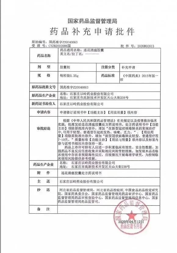 今天(4月14日),以嶺藥業發布午間公告稱:石家莊以嶺藥業股份有限公司和公司全資子公司北京以嶺藥業有限公司收到國家藥品監督管理局下發的連花清瘟膠囊和連花清瘟顆粒的關于新增適應癥申請的《藥品補充申請批件》