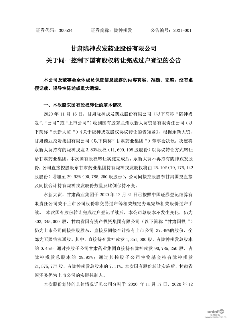 關于同一控制下國有股權轉讓完成過戶登記的公告