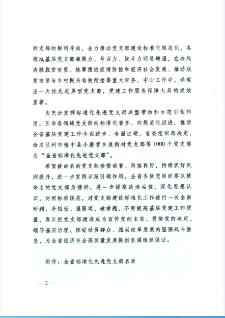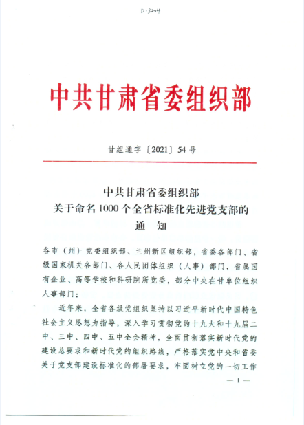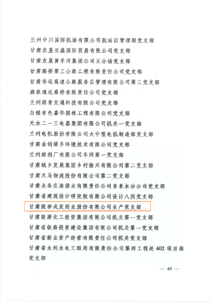 近日,甘肅省委組織部印發《關于命名1000個全省標準化先進黨支部的通知》,對在決戰決勝脫貧攻堅、統籌推進疫情防控和經濟社會發展、推動脫貧攻堅與鄉村振興有效銜接等重大任務、中心工作中涌現出的1000個標準化先進黨支部進行了命名。甘肅隴神戎發藥業股份有限公司所屬生產黨支部光榮上榜。