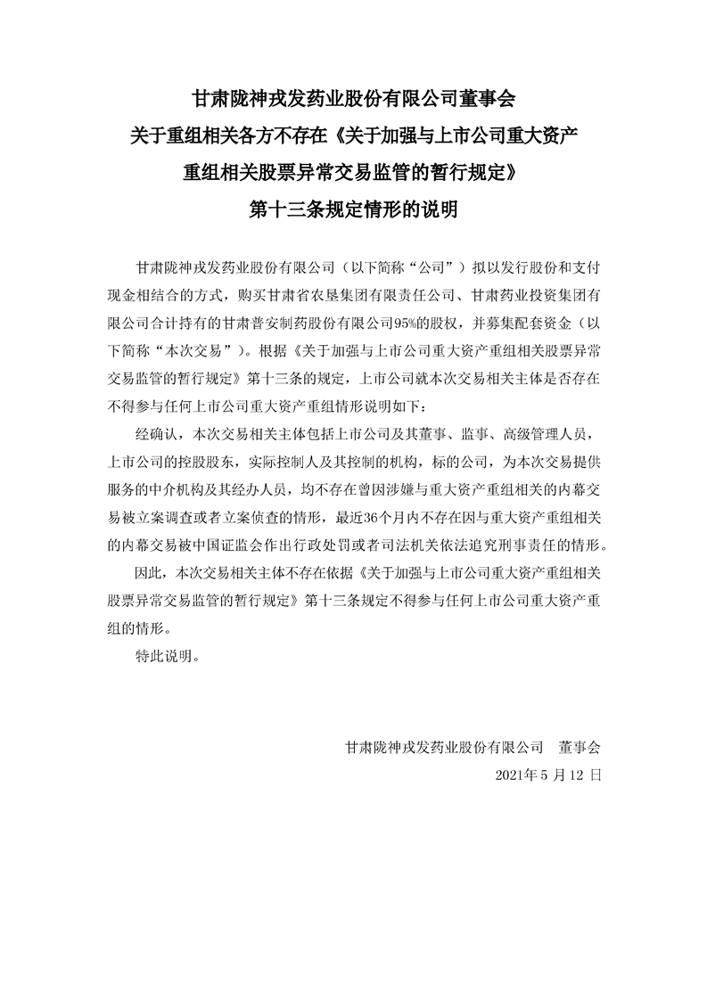 董事會關于重組相關各方不存在《關于加強與上市公司重大資產重組相關股票異常交易監管的暫行規定》第十三條規定情形的說明