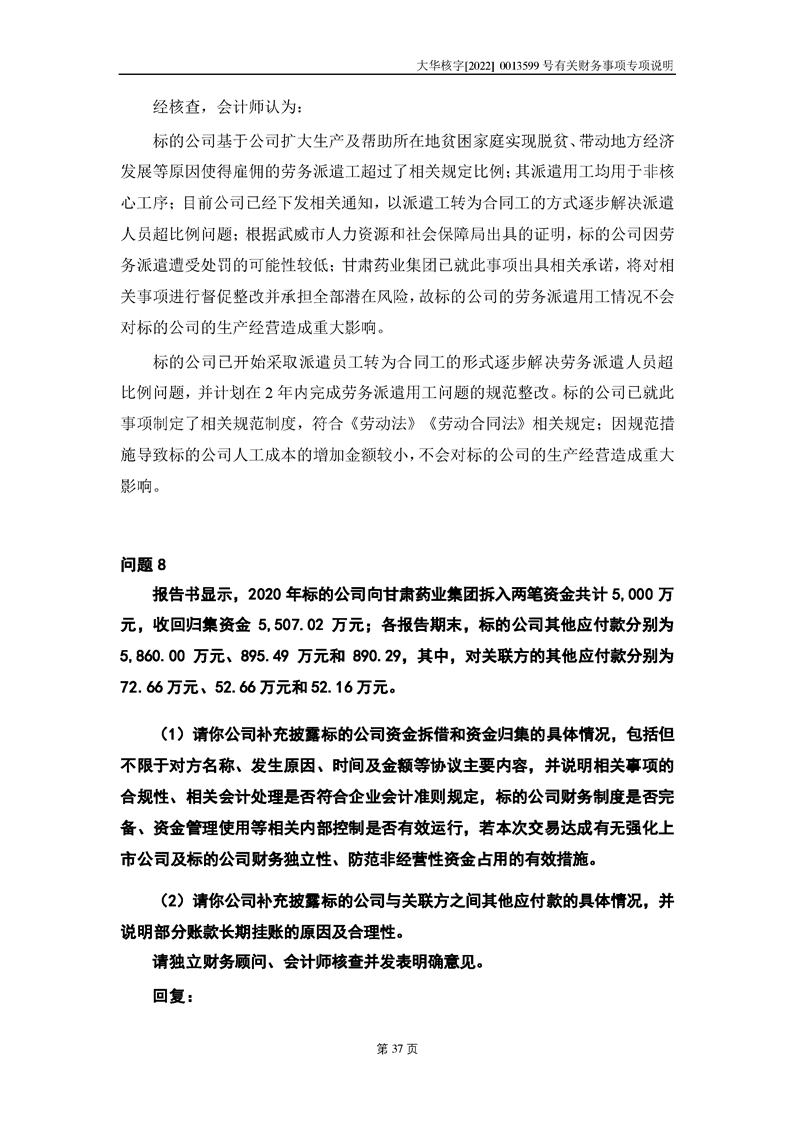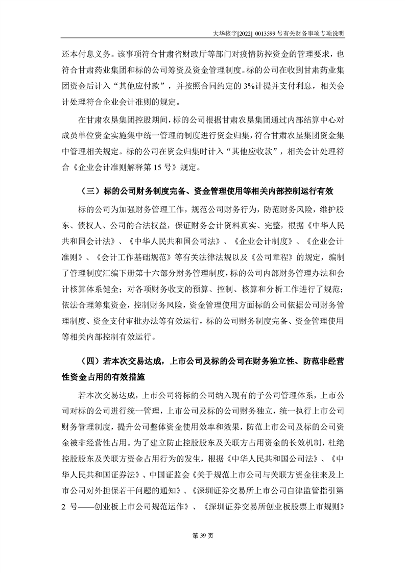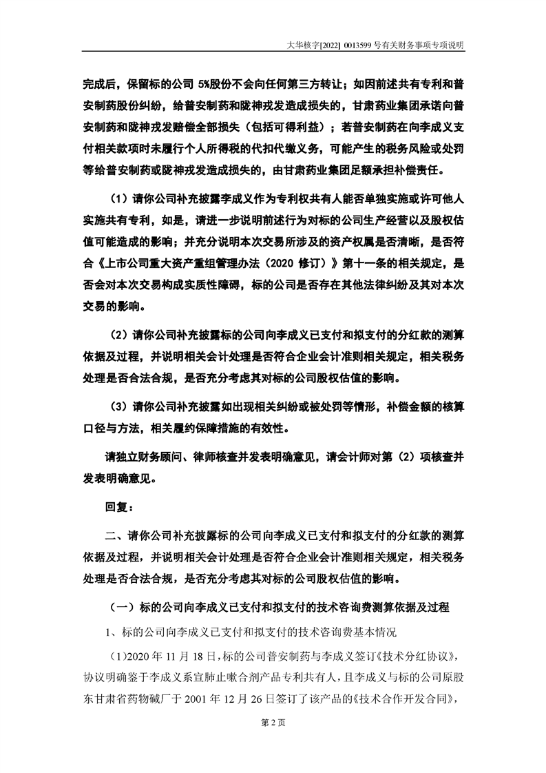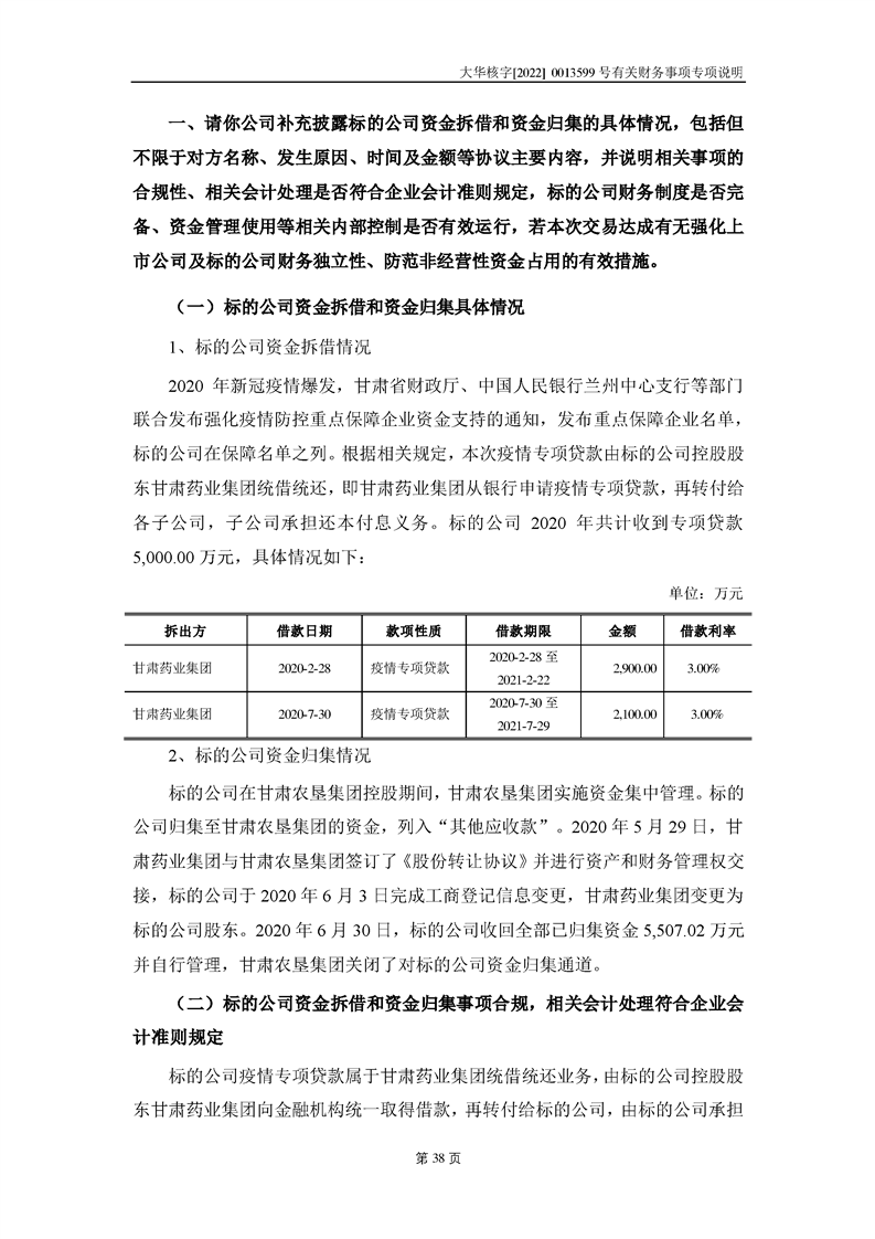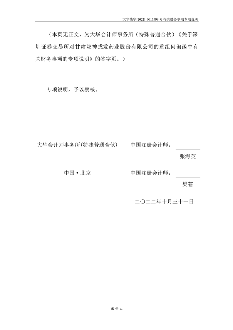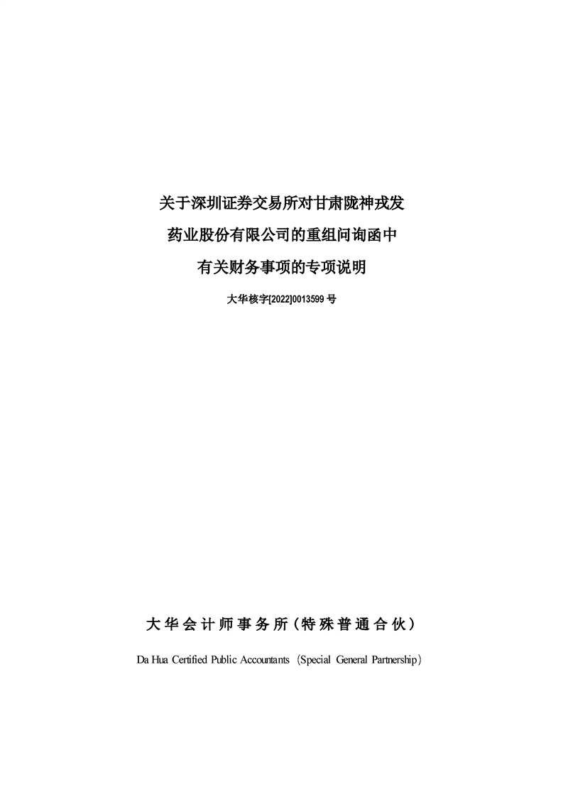 關于深圳證券交易所對甘肅隴神戎發藥業股份有限公司的重組問詢函中有關財務事項的專項說明大華核字[2022]0013599號