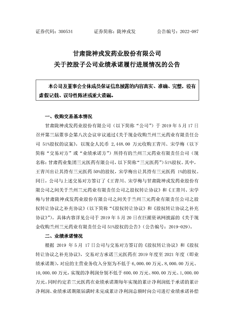 關(guān)于控股子公司業(yè)績承諾履行進展情況的公告