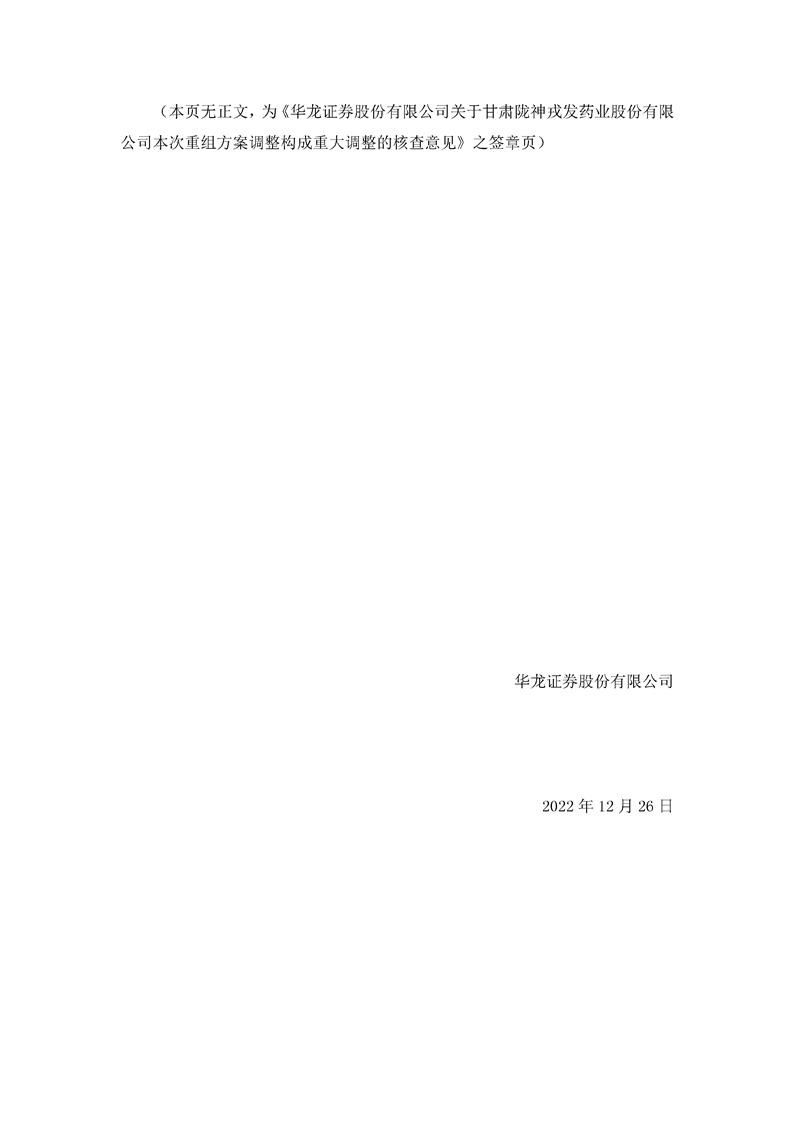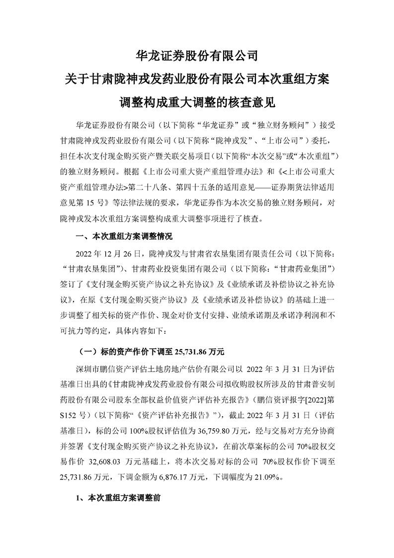 華龍證券股份有限公司關于甘肅隴神戎發藥業股份有限公司本次重組方案調整構成重大調整的核查意見