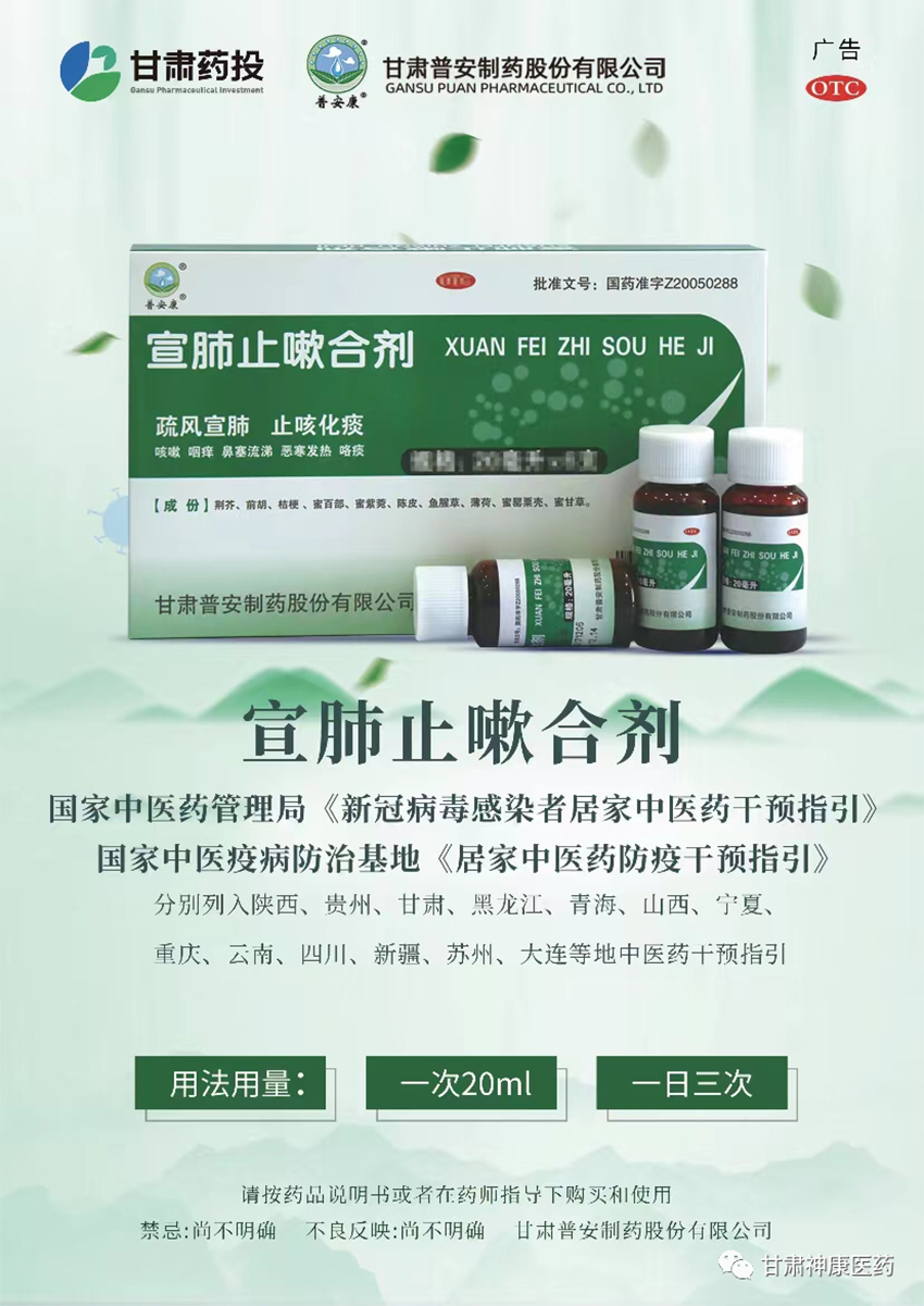 國家中醫藥管理局、國家中醫疫病防治基地等先后發布居家中醫藥干預指引、專家共識。全國各省(市)先后發布“新冠感染”居家治療用藥指南,甘肅藥業集團宣肺止嗽合劑獲多方權威機構推薦。多地政府機構、醫療衛生機構紛紛緊急訂購宣肺止嗽合劑,用以保障當地醫療衛生機構分級診療用藥及政府藥品備用。甘肅藥業集團全力組織藥品生產企業普安制藥開足馬力生產,盡最大努力保障群眾用藥需求。