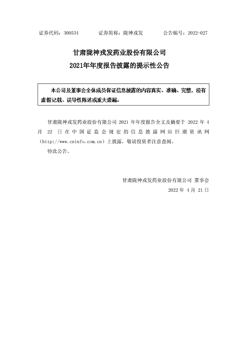 2021年年度報告披露的提示性公告