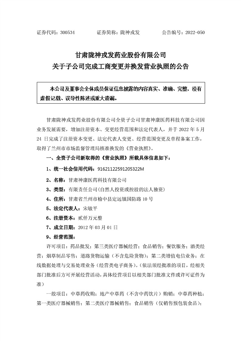 關于子公司完成工商變更并換發營業執照的公告