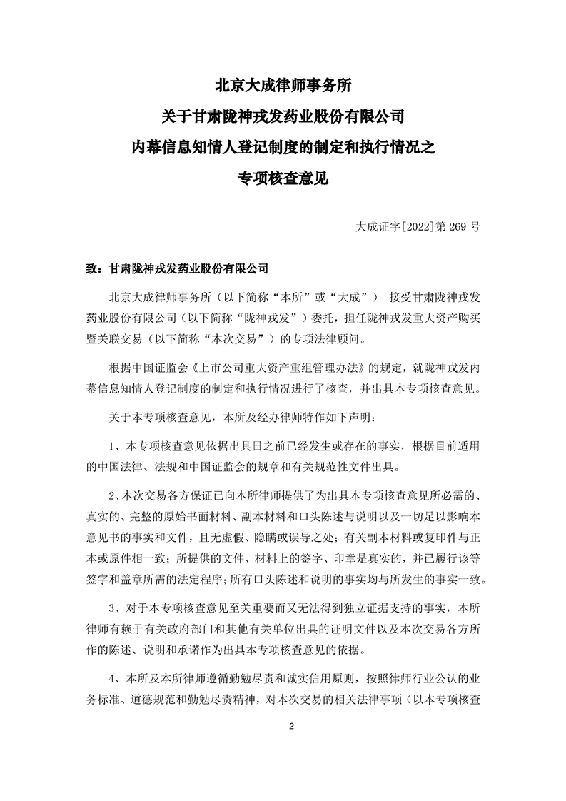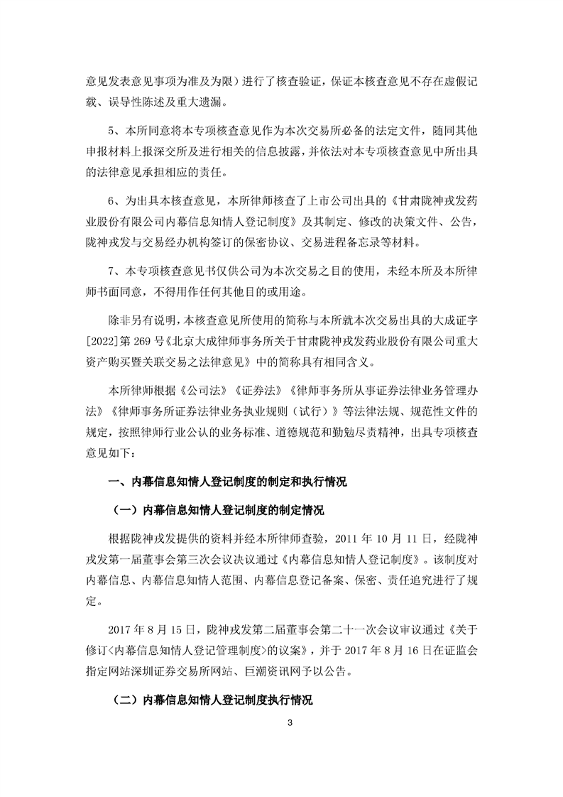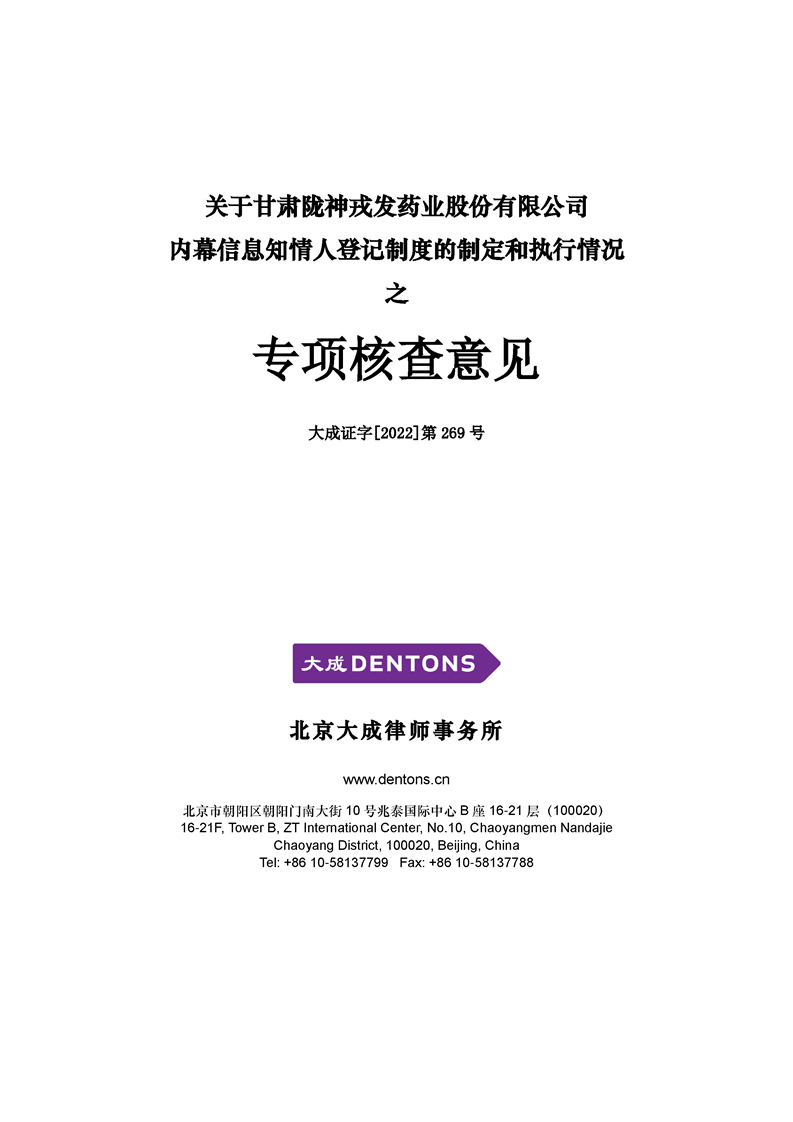 北京大成律師事務所關于隴神戎發內幕信息知情人登記制度的制定和執行情況專項核查意見