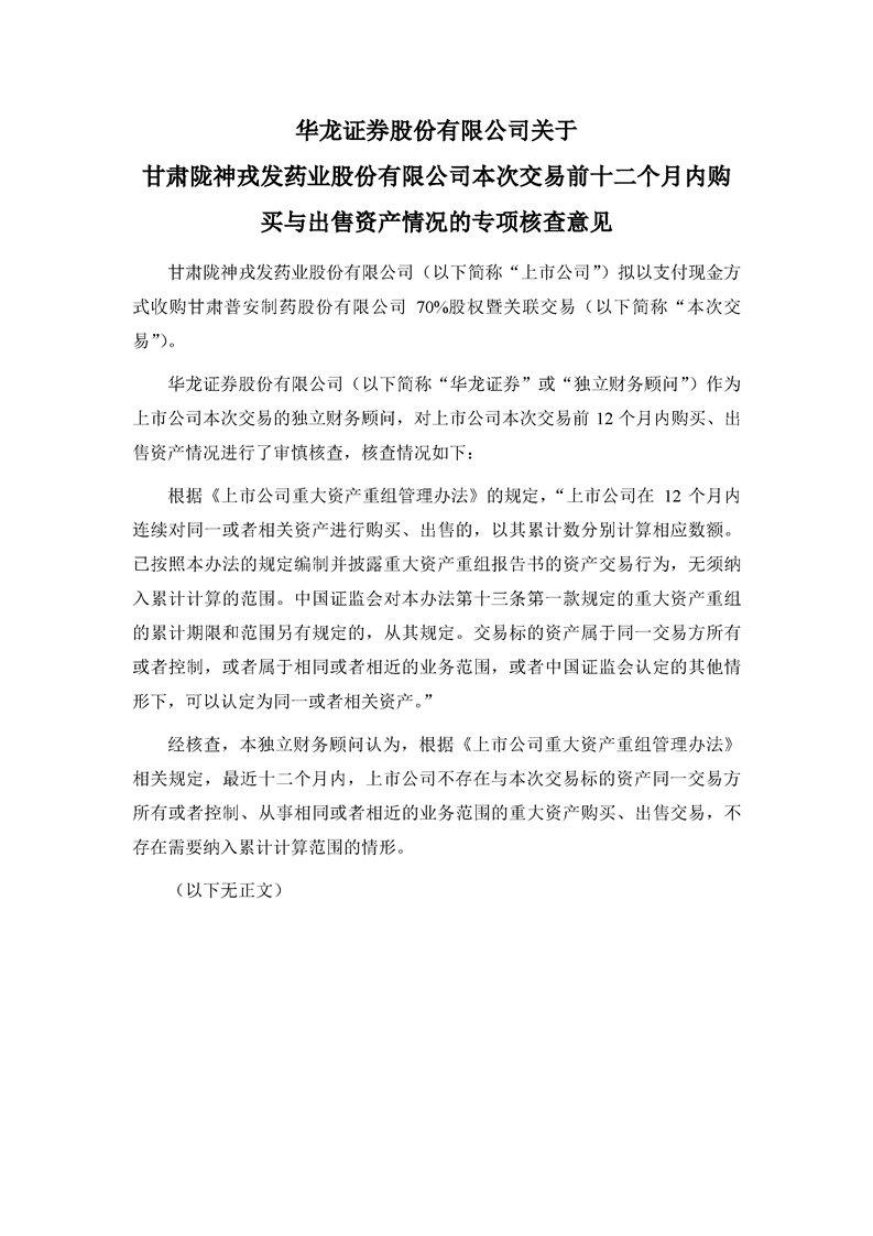 華龍證券股份有限公司關(guān)于甘肅隴神戎發(fā)藥業(yè)股份有限公司本次交易前十二個(gè)月內(nèi)購(gòu)買與出售資產(chǎn)情況的專項(xiàng)核查意見(jiàn)