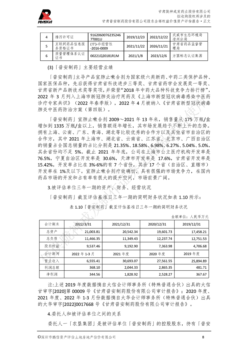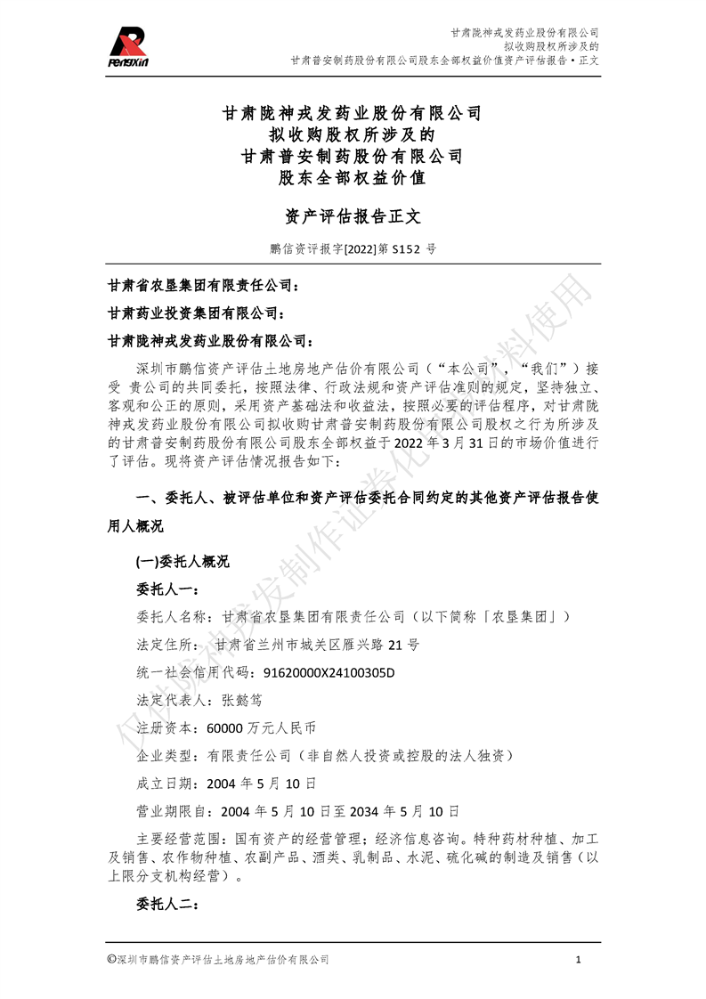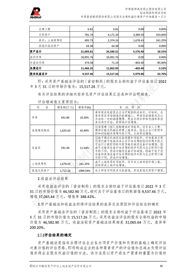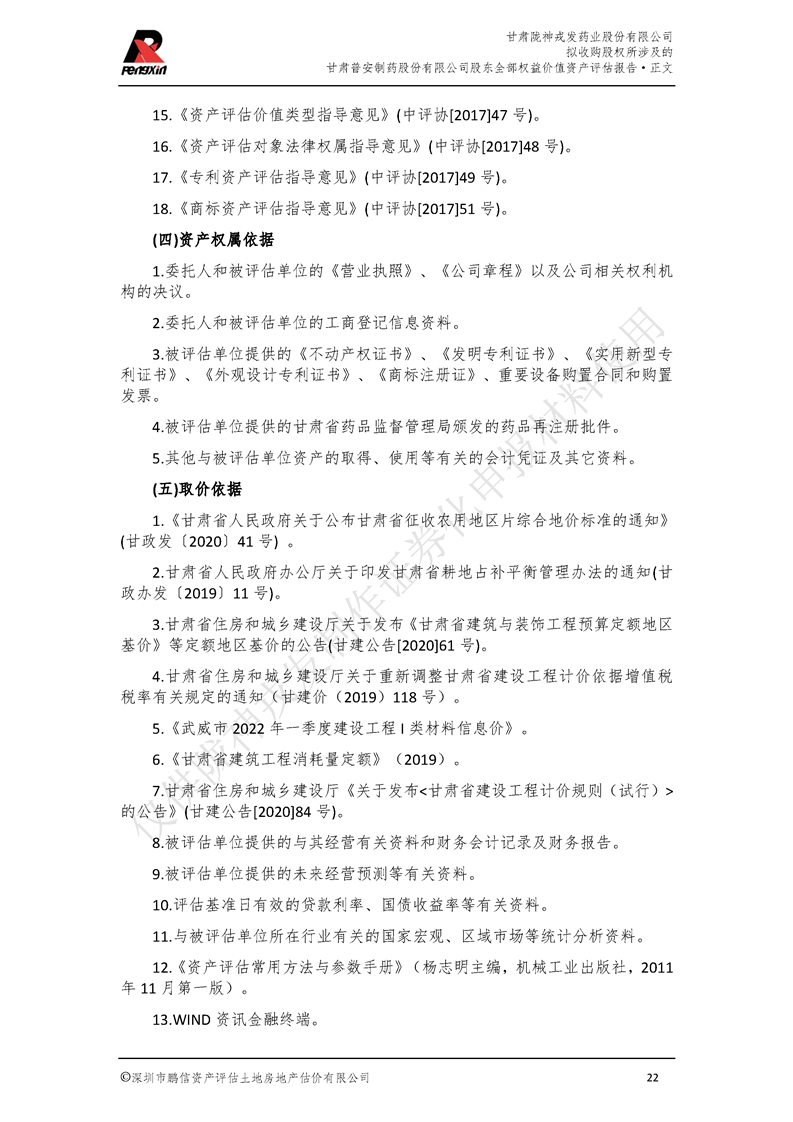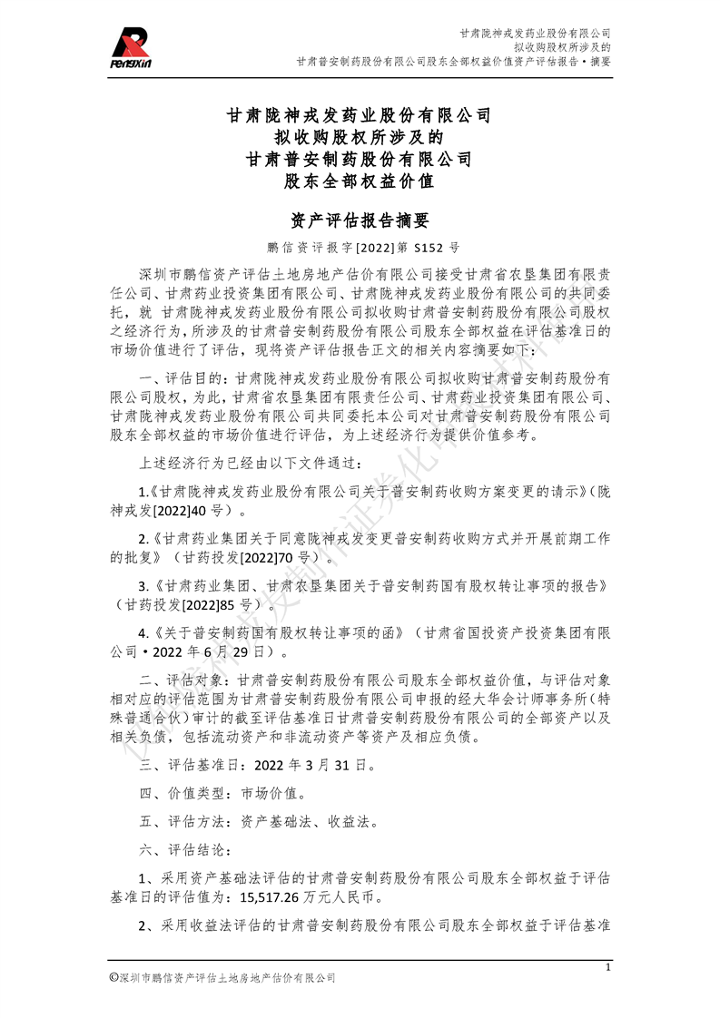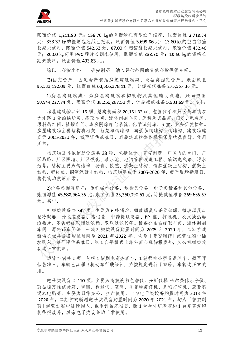 甘肅普安制藥股份有限公司全部權益價值資產評估報告-鵬信資評報字[2022]第S152號