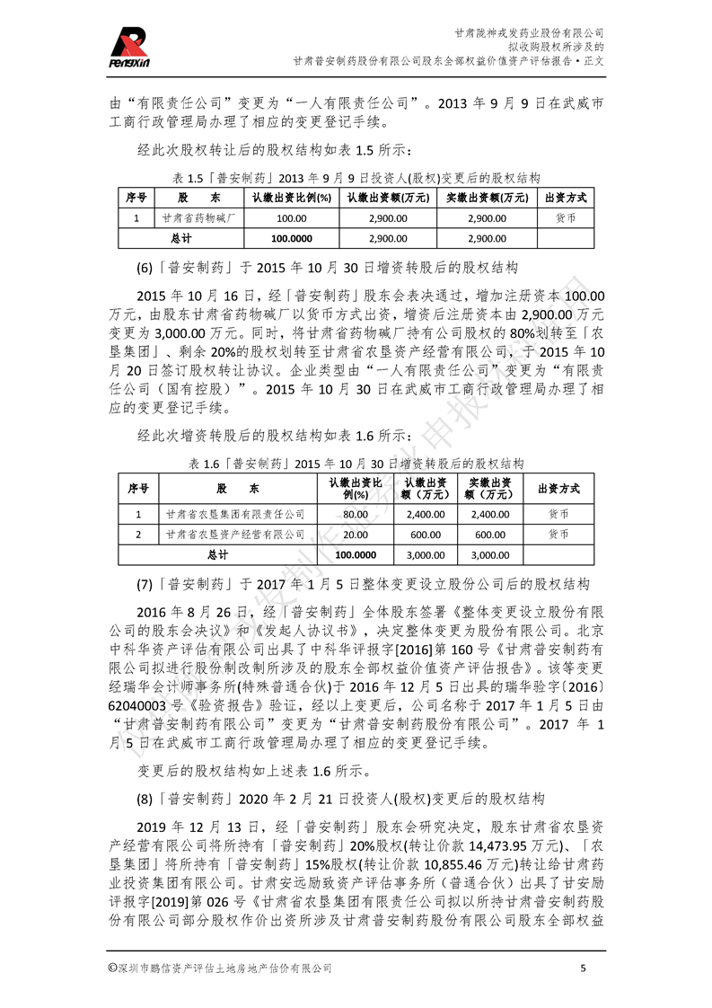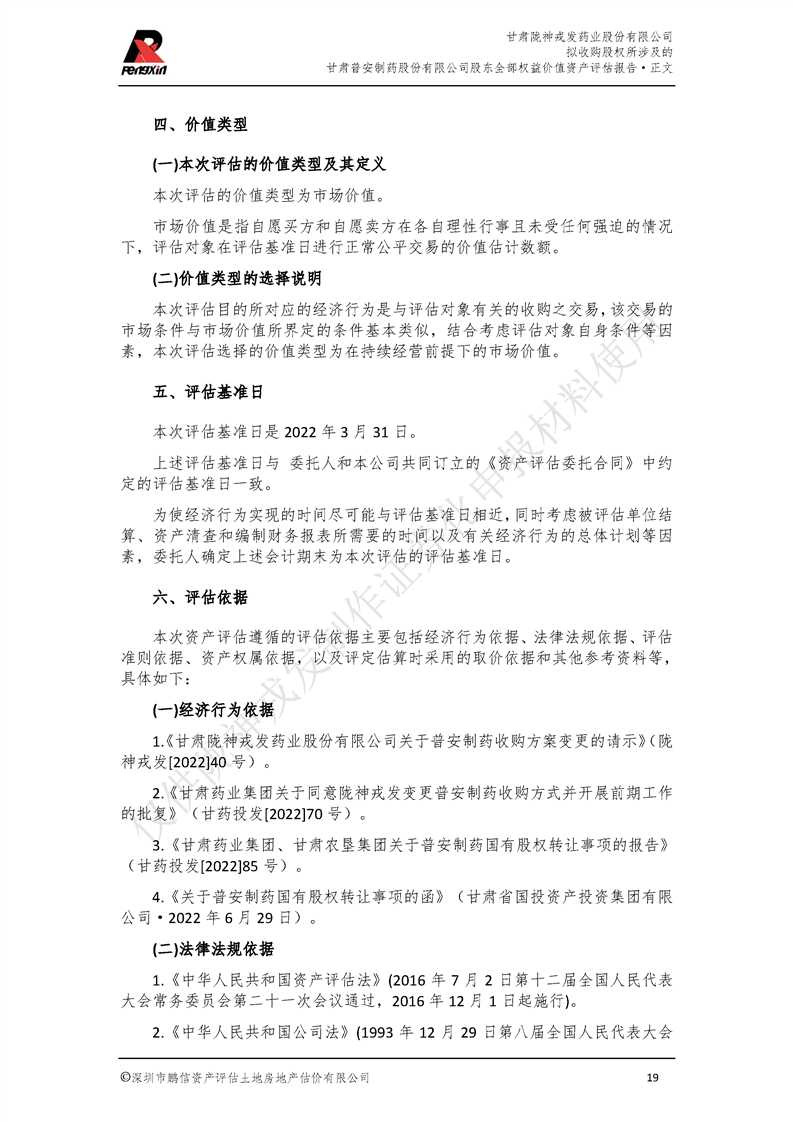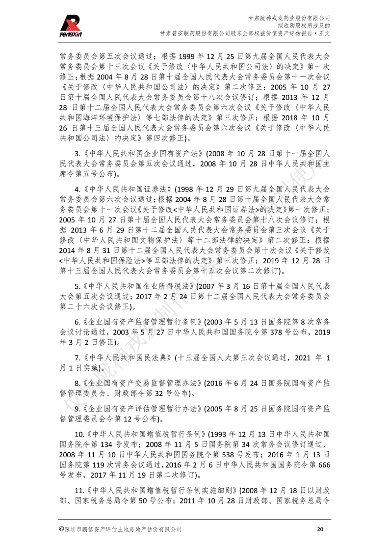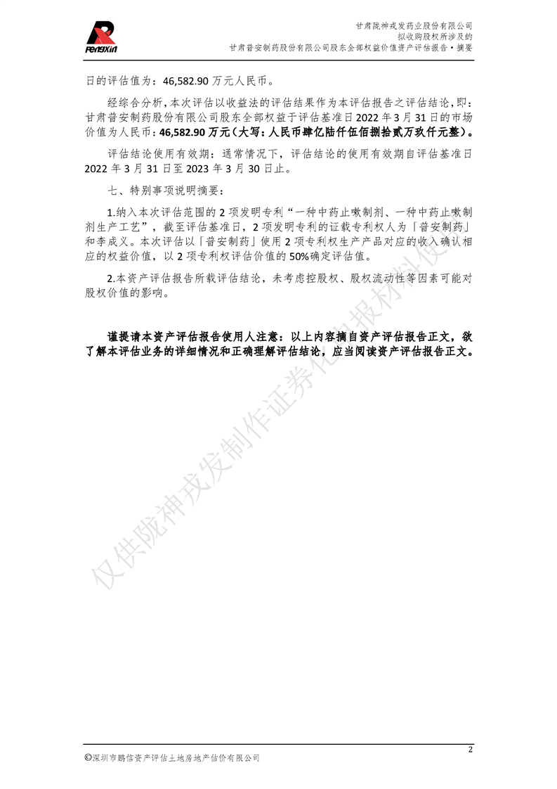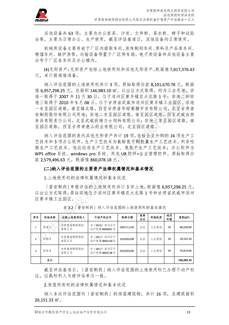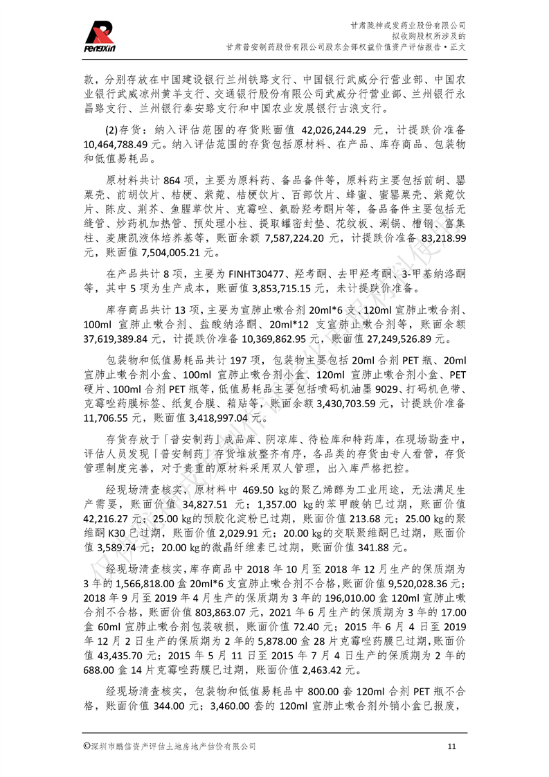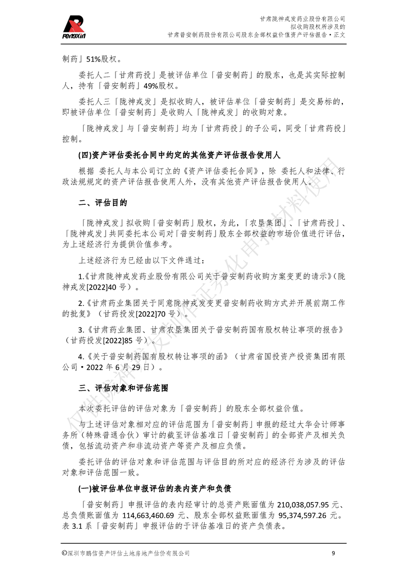 甘肅普安制藥股份有限公司全部權益價值資產評估報告-鵬信資評報字[2022]第S152號