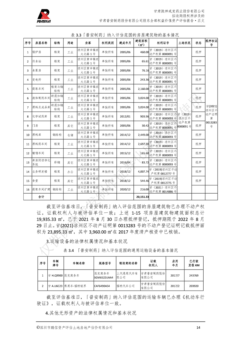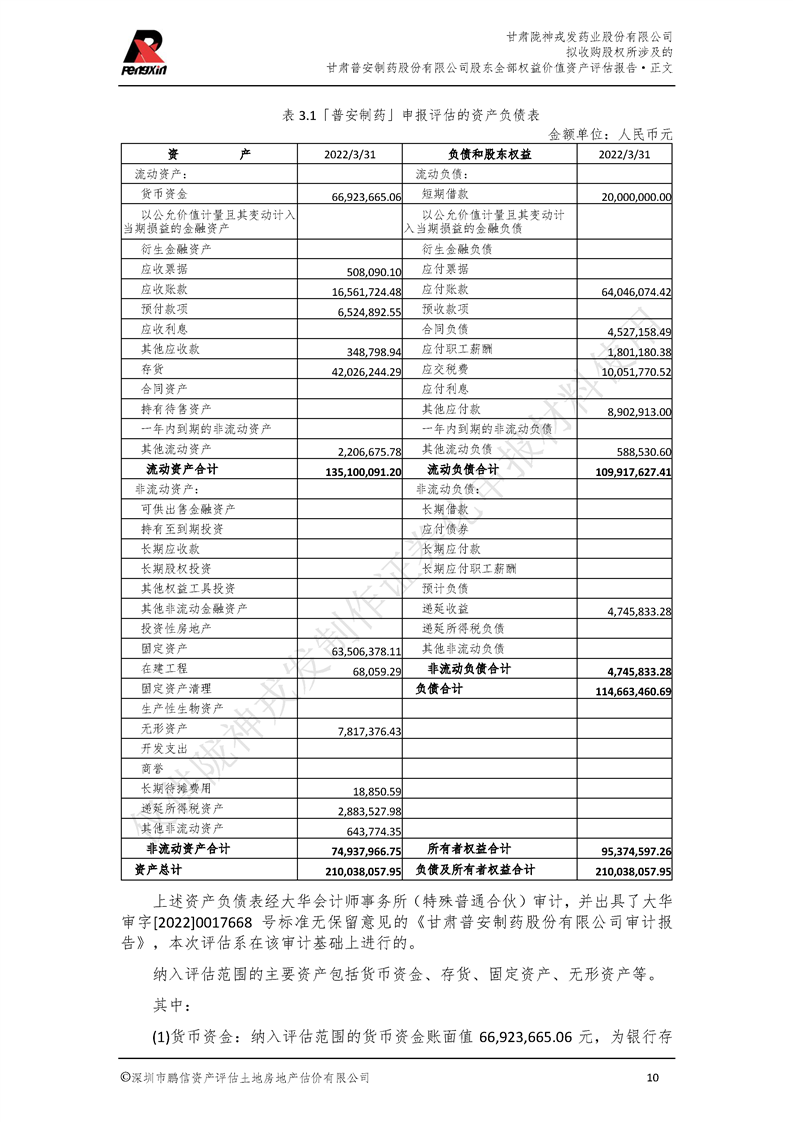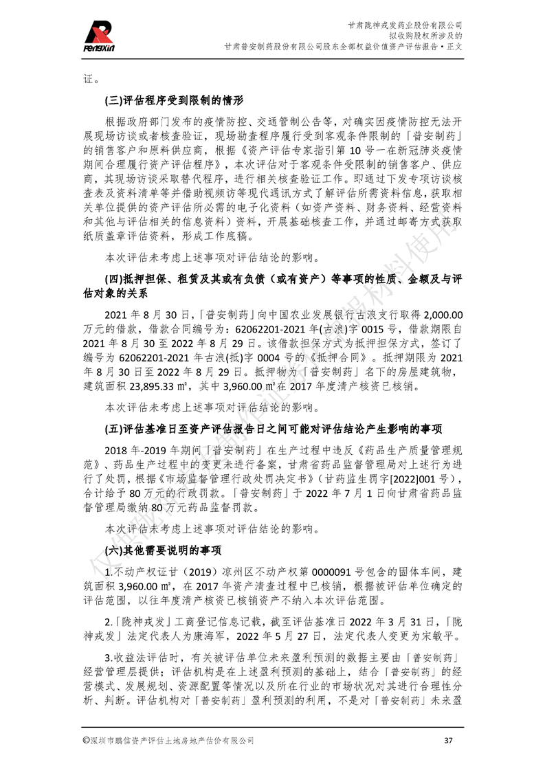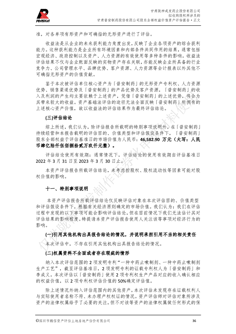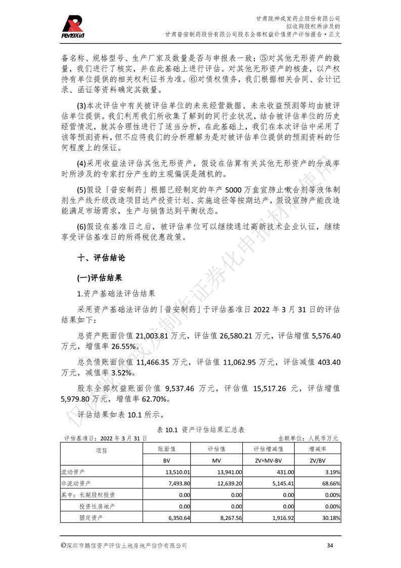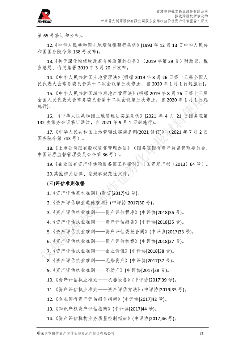 甘肅普安制藥股份有限公司全部權益價值資產評估報告-鵬信資評報字[2022]第S152號