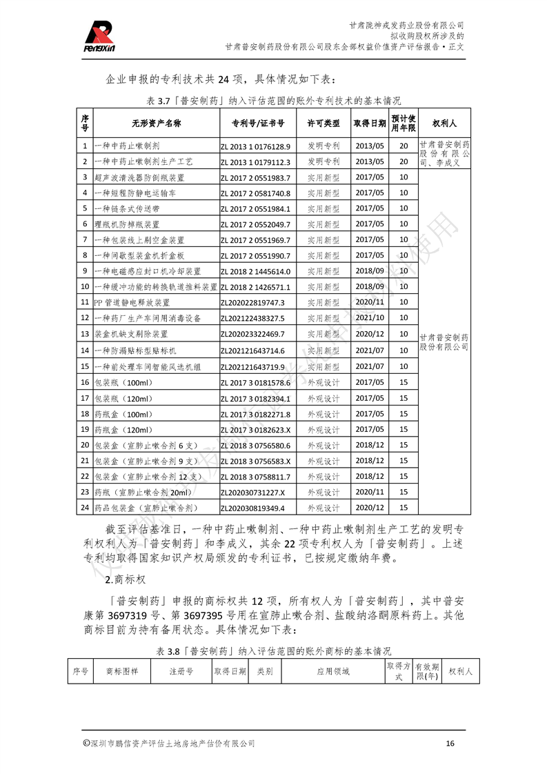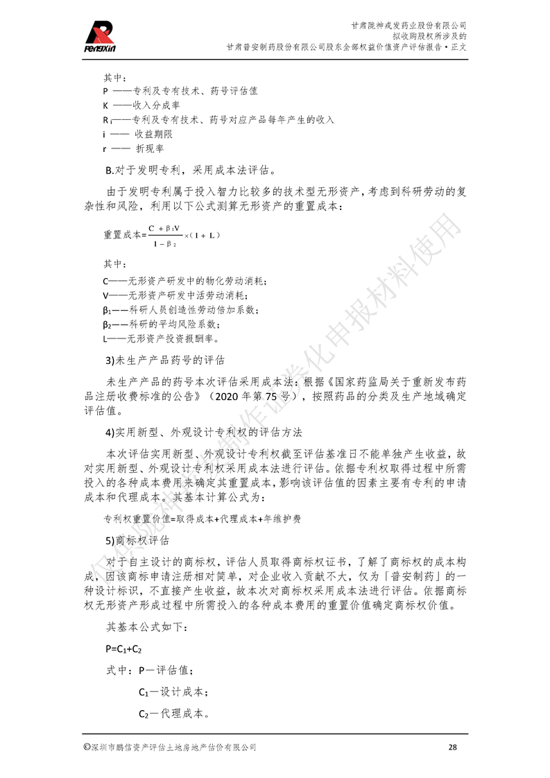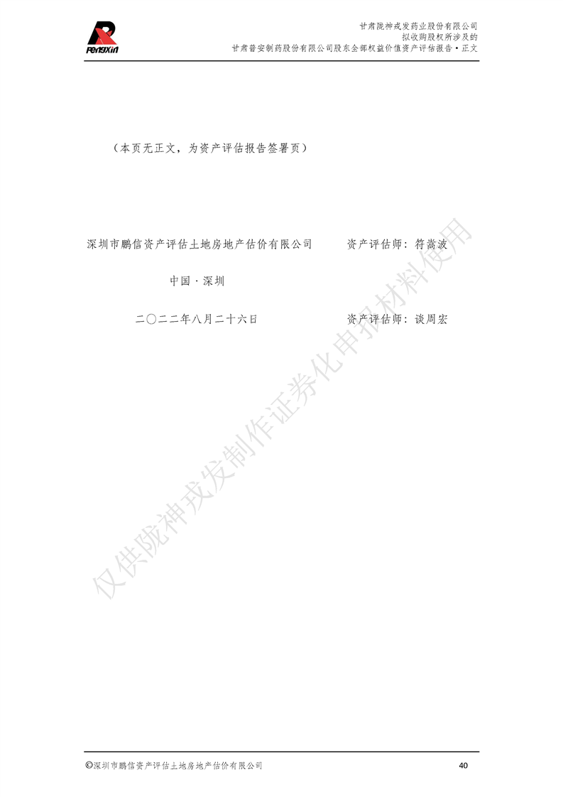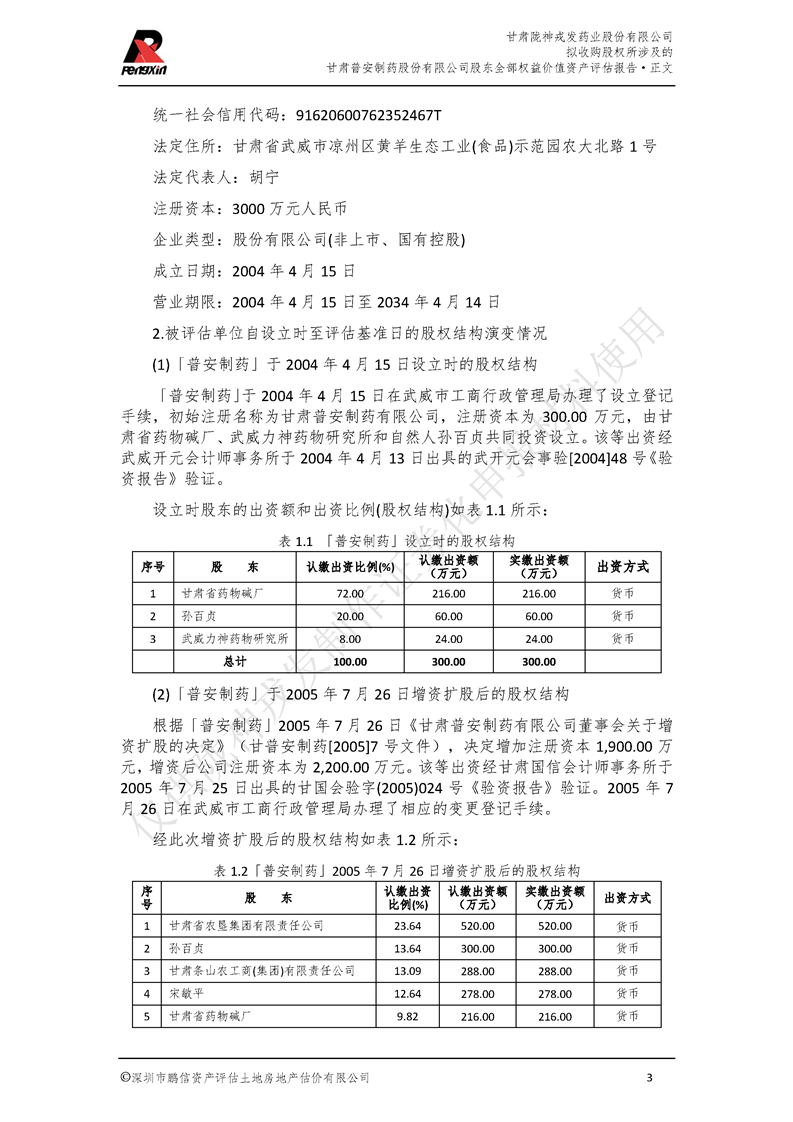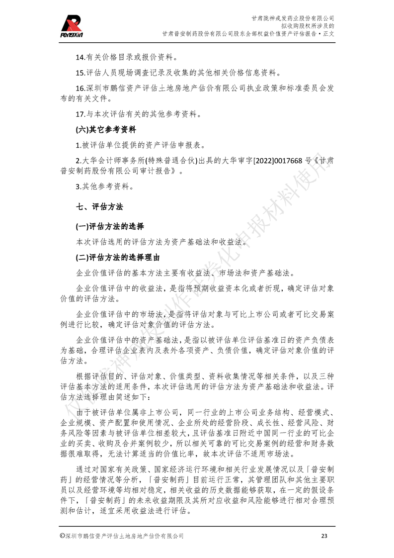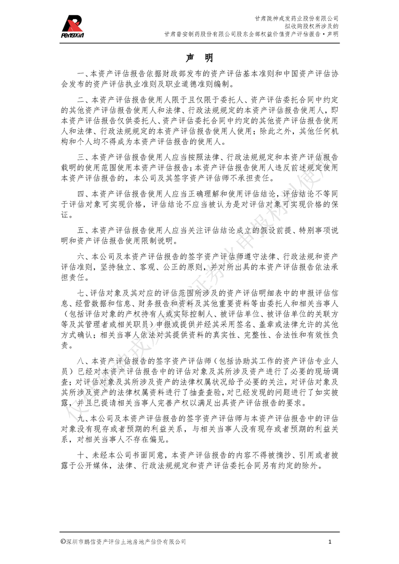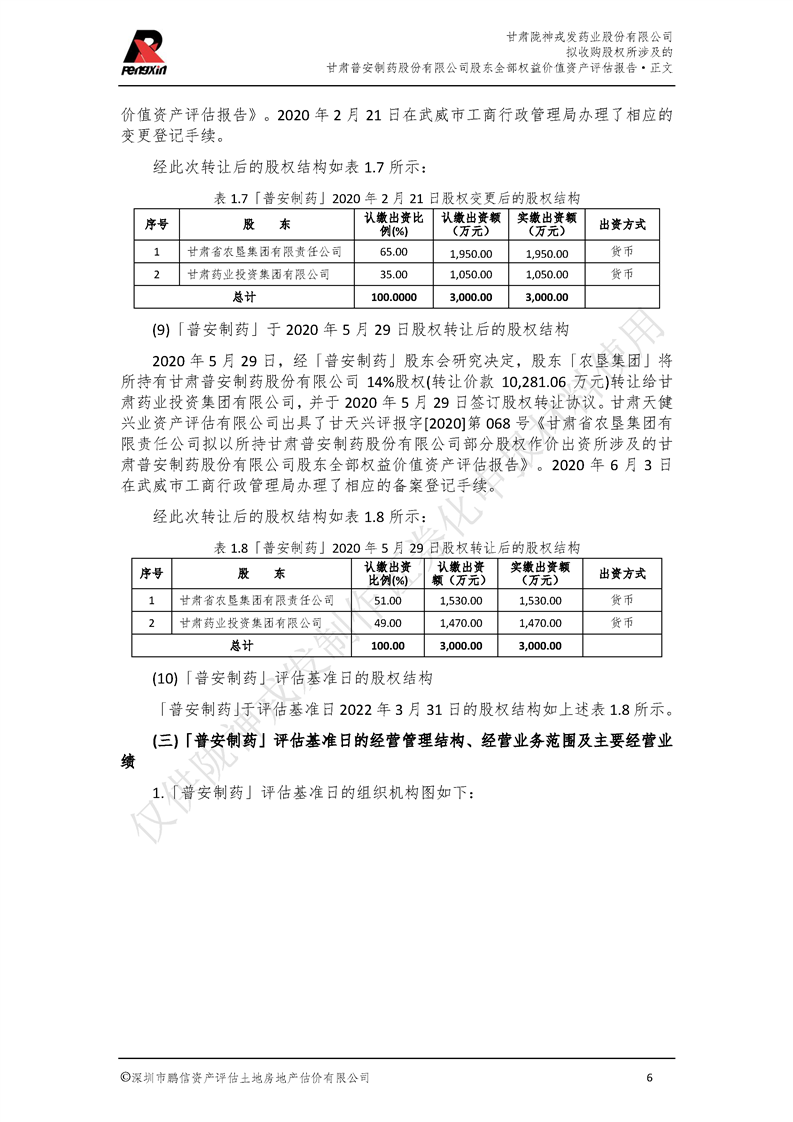 甘肅普安制藥股份有限公司全部權益價值資產評估報告-鵬信資評報字[2022]第S152號