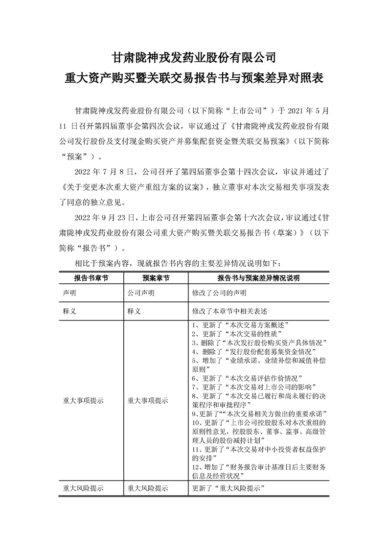 甘肅隴神戎發(fā)藥業(yè)股份有限公司重大資產(chǎn)購買暨關(guān)聯(lián)交易報(bào)告書與預(yù)案差異對照表