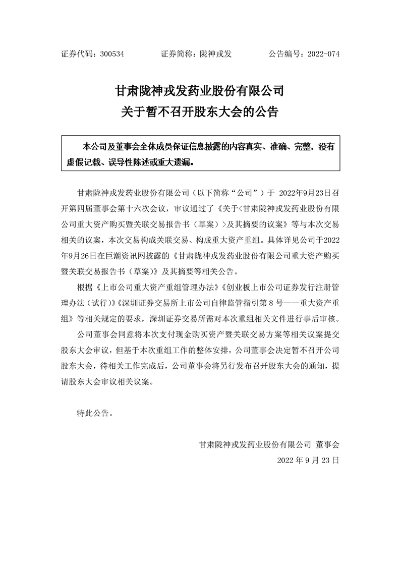 關于暫不召開股東大會的公告
