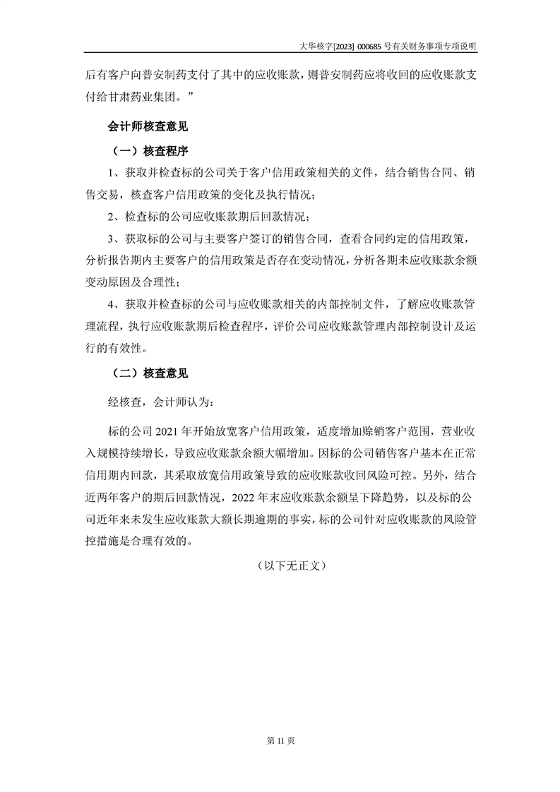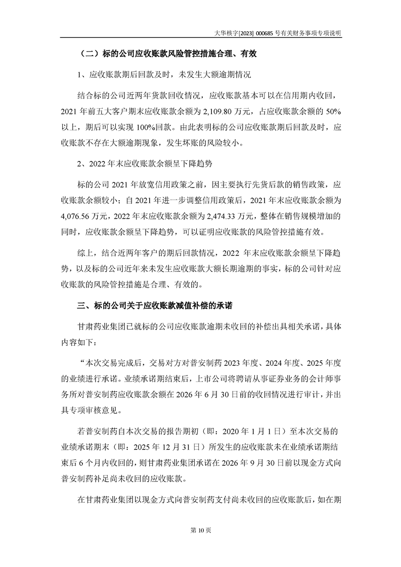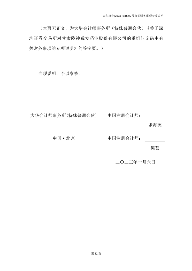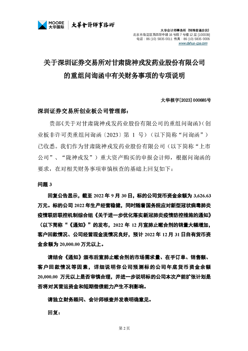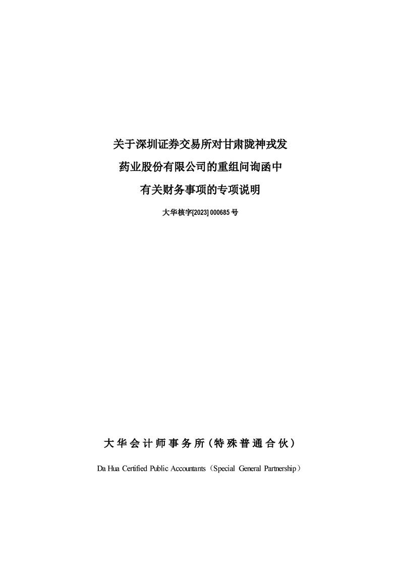大華會計師事務所關于深圳證券交易所對甘肅隴神戎發藥業股份有限公司的重組問詢函中有關財務事項的專項說明-大華核字[2023]000685號