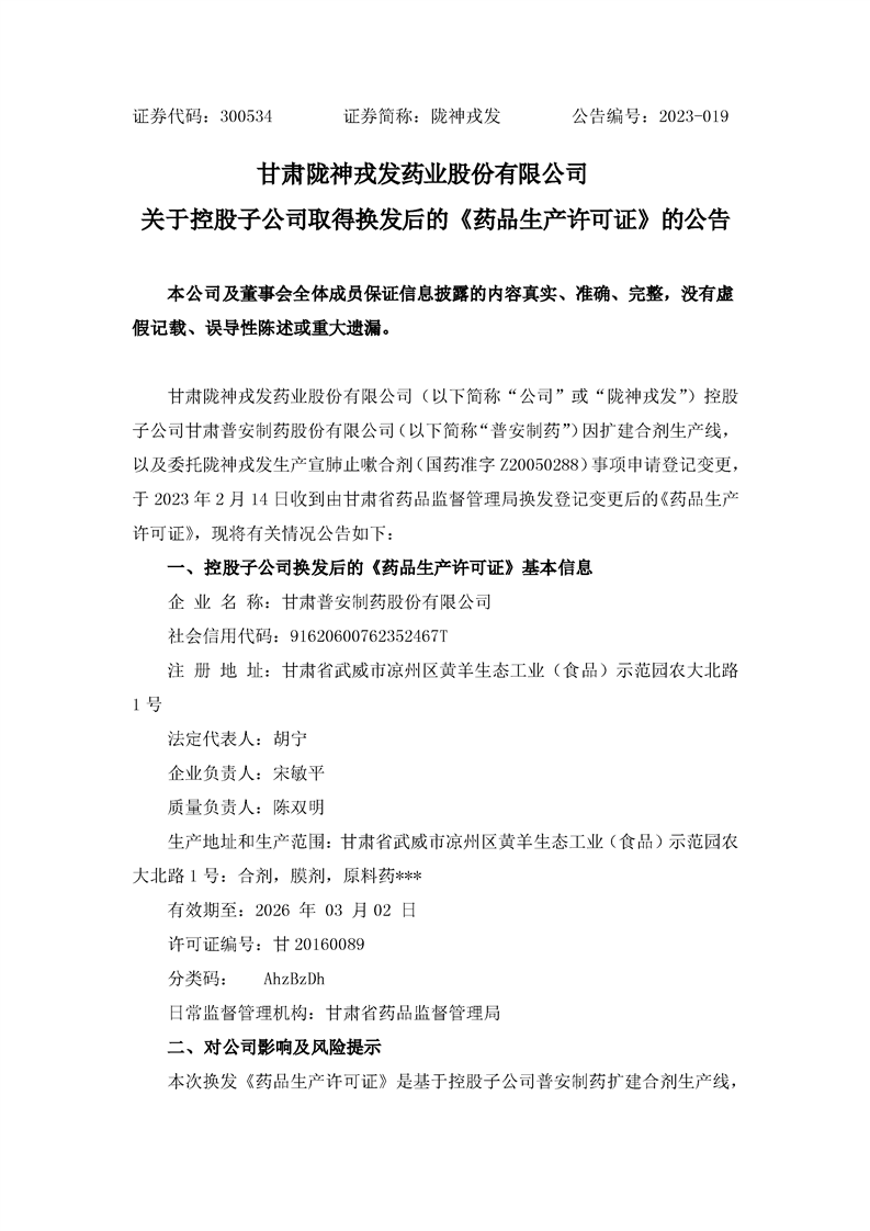 關于控股子公司取得換發后的《藥品生產許可證》的公告