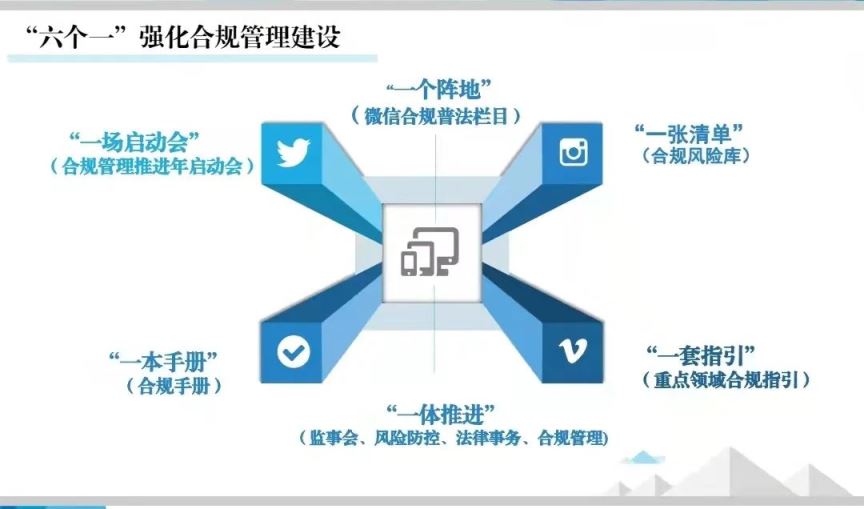 “一個陣地”——堅持用特色化、品牌化發展思路引領合規工作,加強合規文化品牌和陣地建設,充分運用微信公眾平臺創新打造法律合規學習陣地《法治強企》欄目,以“圖片+視頻+文字”的形式自制35期重點合規學習內容,內容涵蓋企業投資并購、公司治理、合規管理等專題。目前,正在組織籌建“合規信息平臺”,預計于五月上旬正式上線,作為日常合規管理、合規知識學習、合規指引應運、合規風險檢索的基礎平臺。