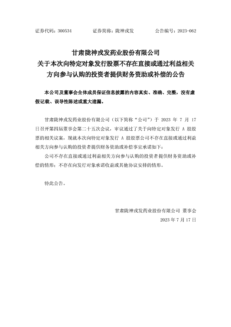 關于本次向特定對象發行股票不存在直接或通過利益相關方向參與認購的投資者提供財務資助或補償的公告