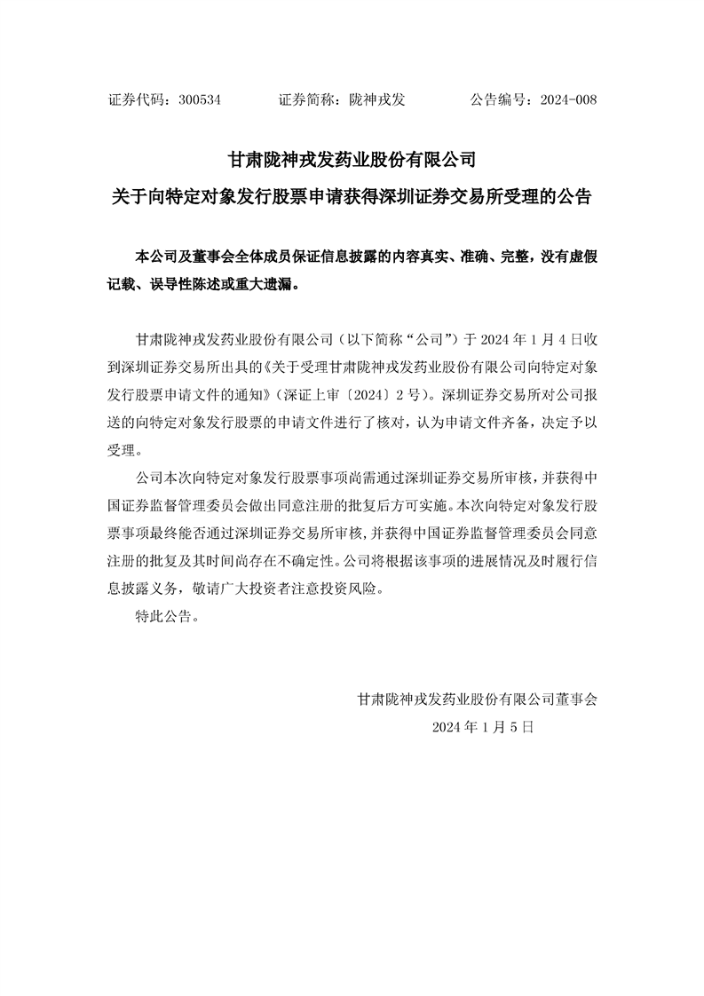 關于向特定對象發行股票申請獲得深圳證券交易所受理的公告