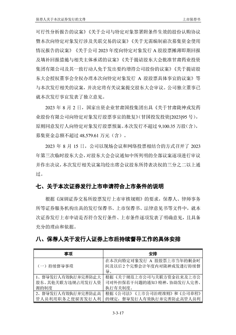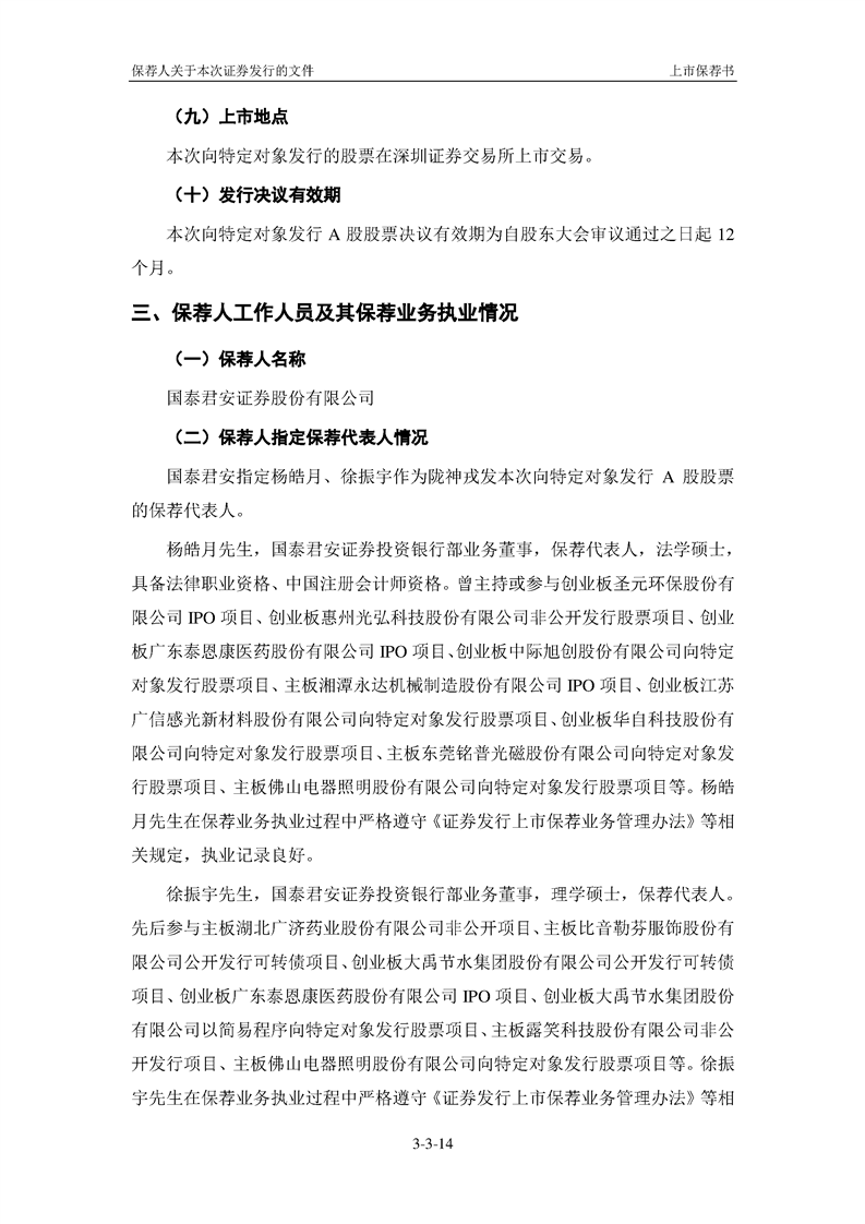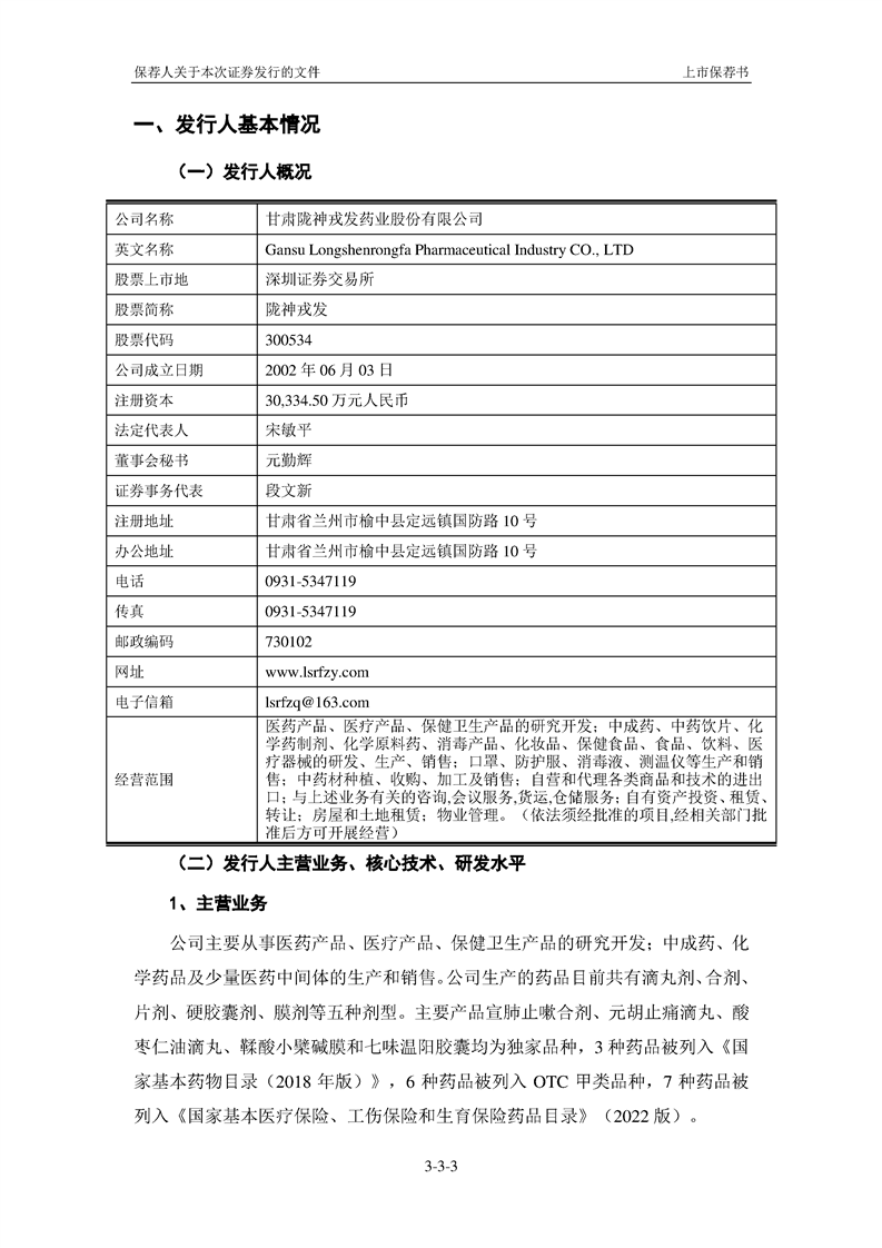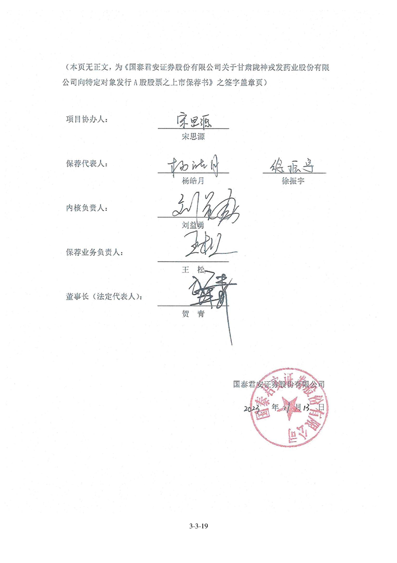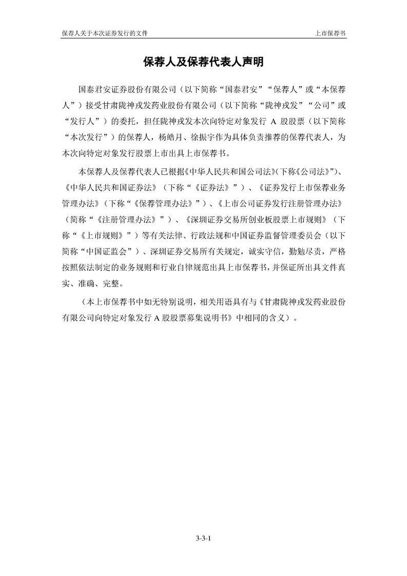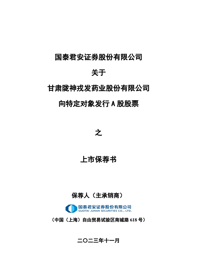 國(guó)泰君安證券股份有限公司關(guān)于甘肅隴神戎發(fā)藥業(yè)股份有限公司向特定對(duì)象發(fā)行A股股票之上市保薦書
