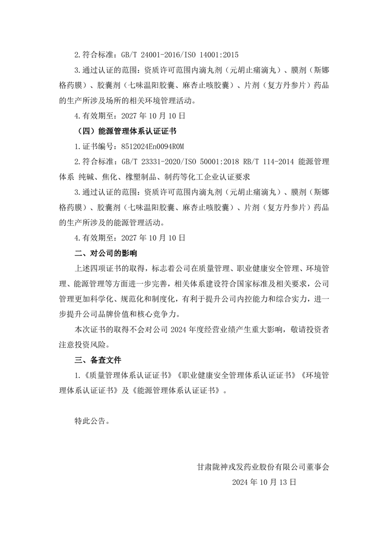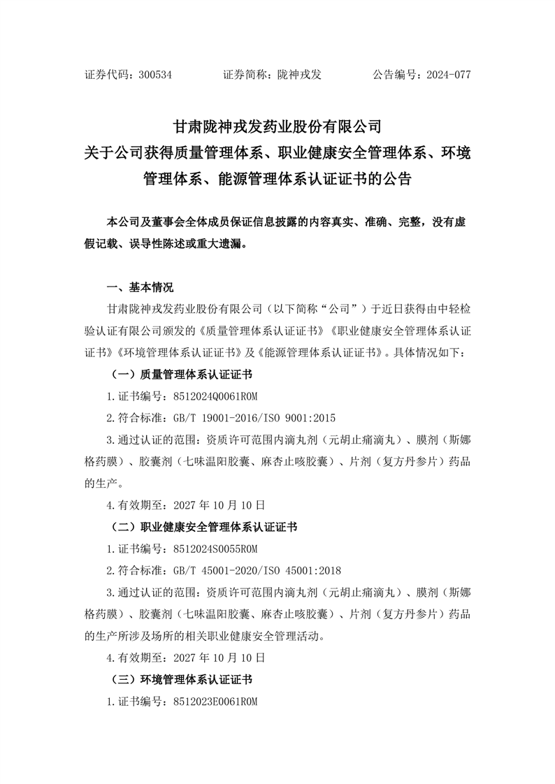 關于公司獲得質量管理體系、職業健康安全管理體系、環境管理體系、能源管理體系認證證書的公告