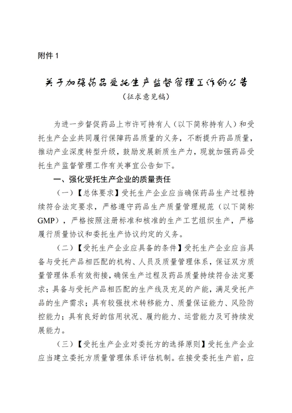 附件:1.關于加強藥品受托生產監督管理工作的公告(征求意見稿)