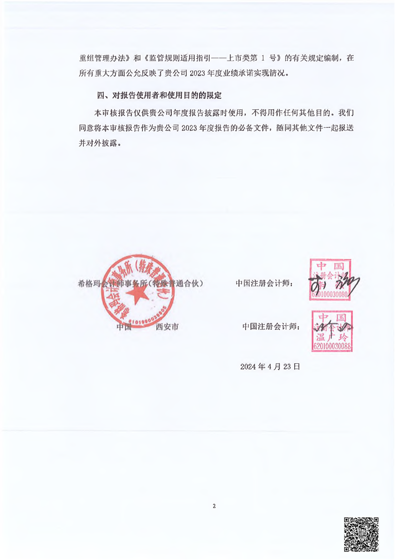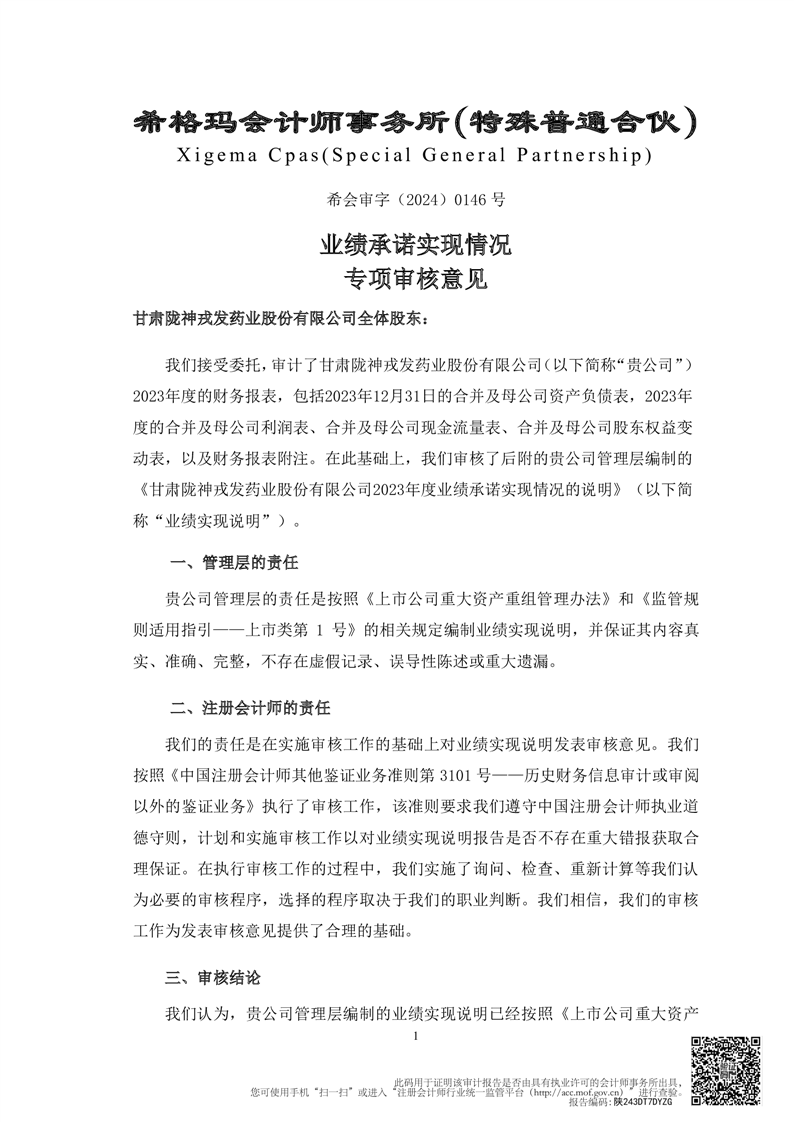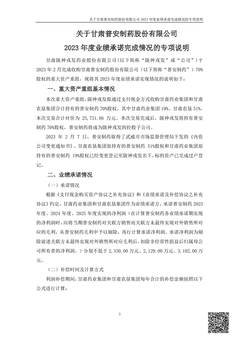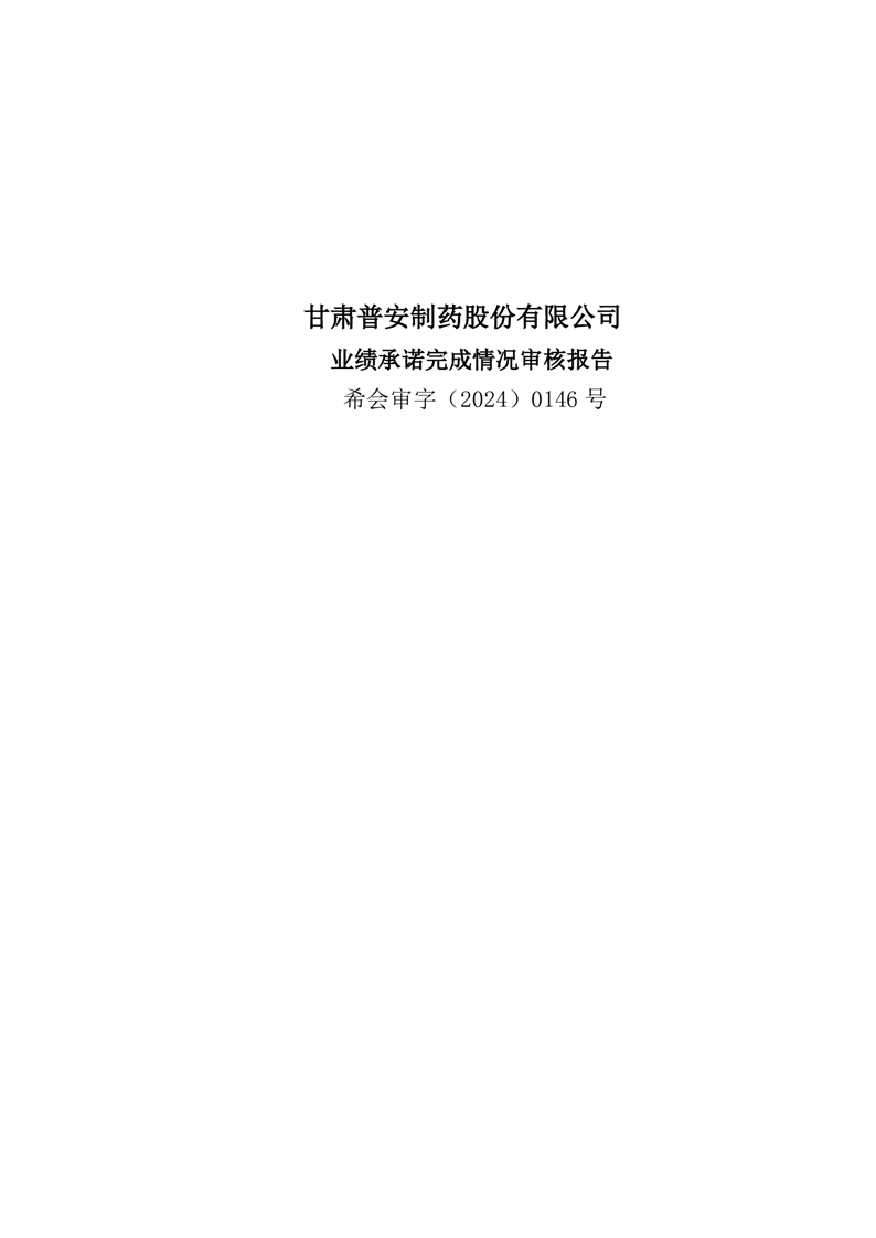 甘肅普安制藥股份有限公司業績承諾完成情況審核報告