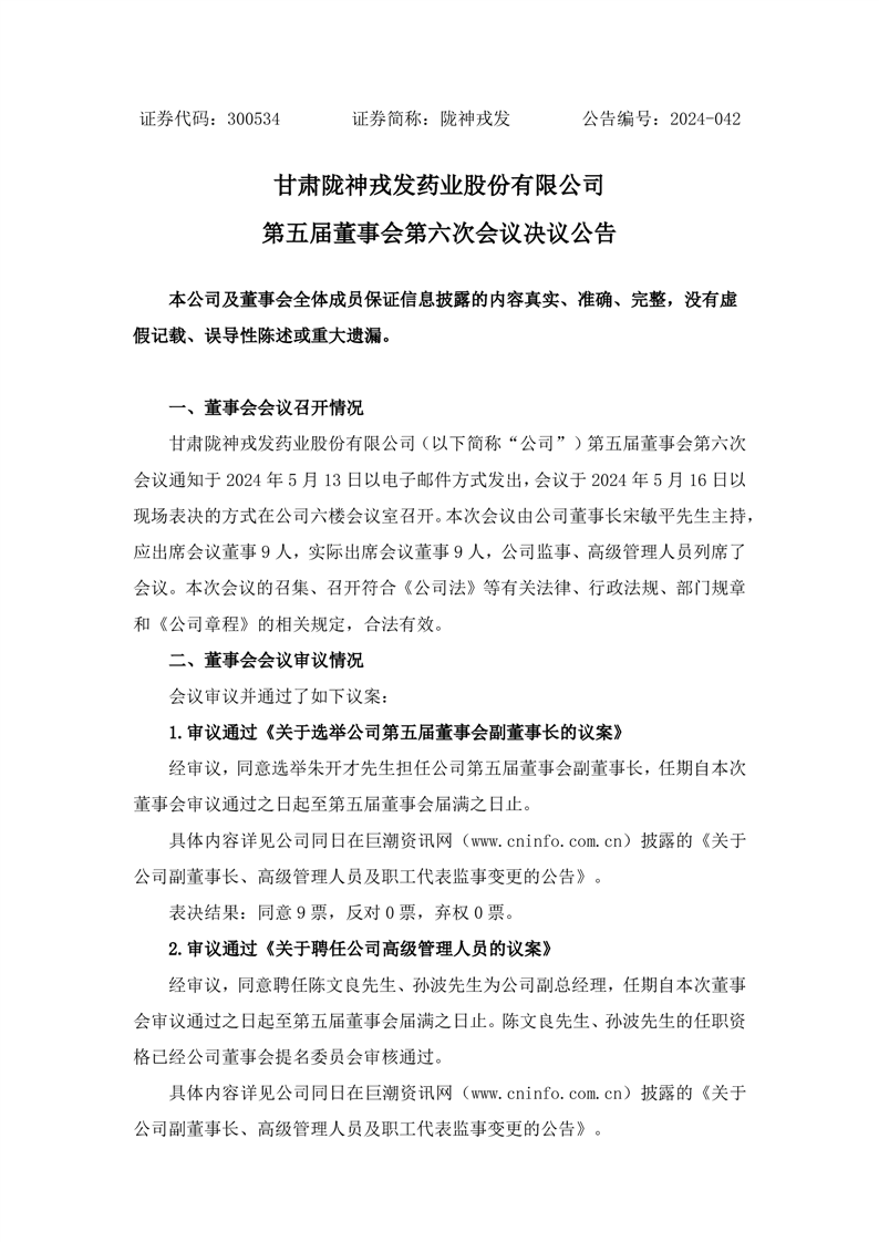 第五屆董事會第六次會議決議公告