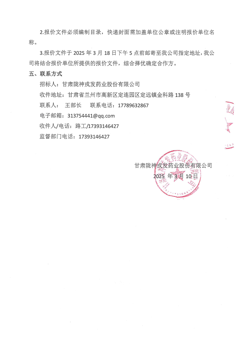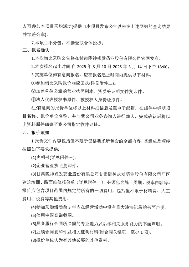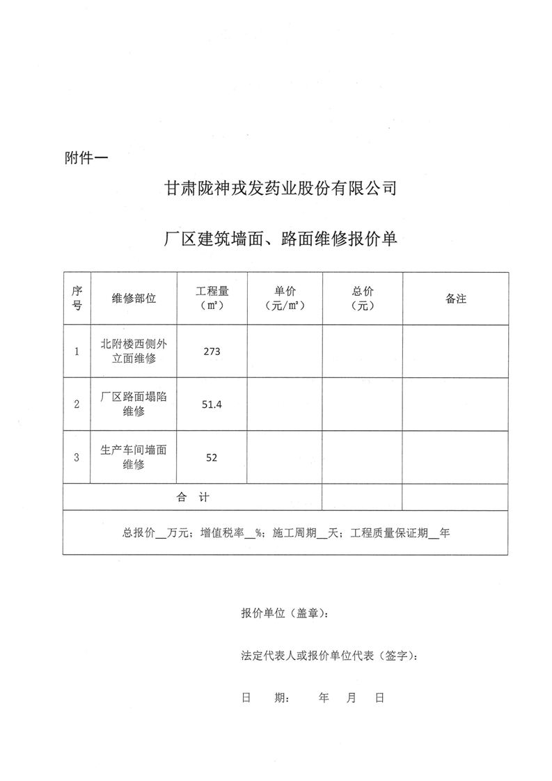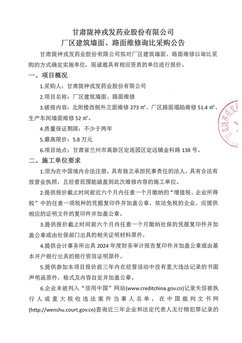 甘肅隴神戎發藥業股份有限公司廠區建筑墻面、路面維修詢比采購公告