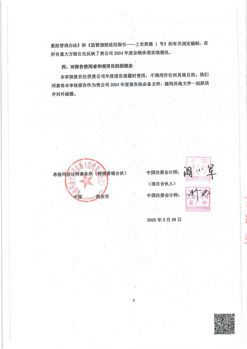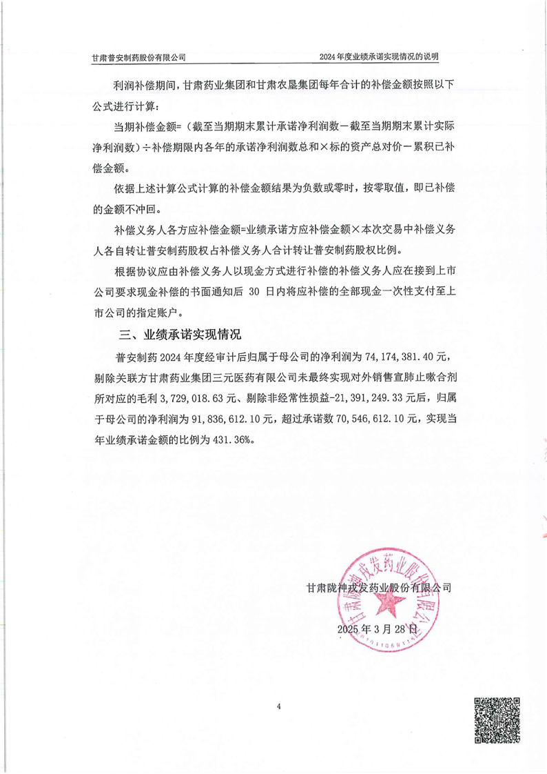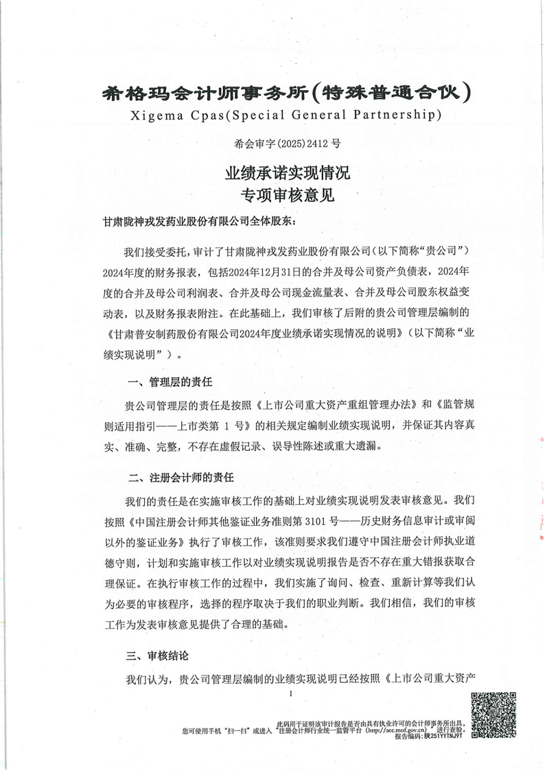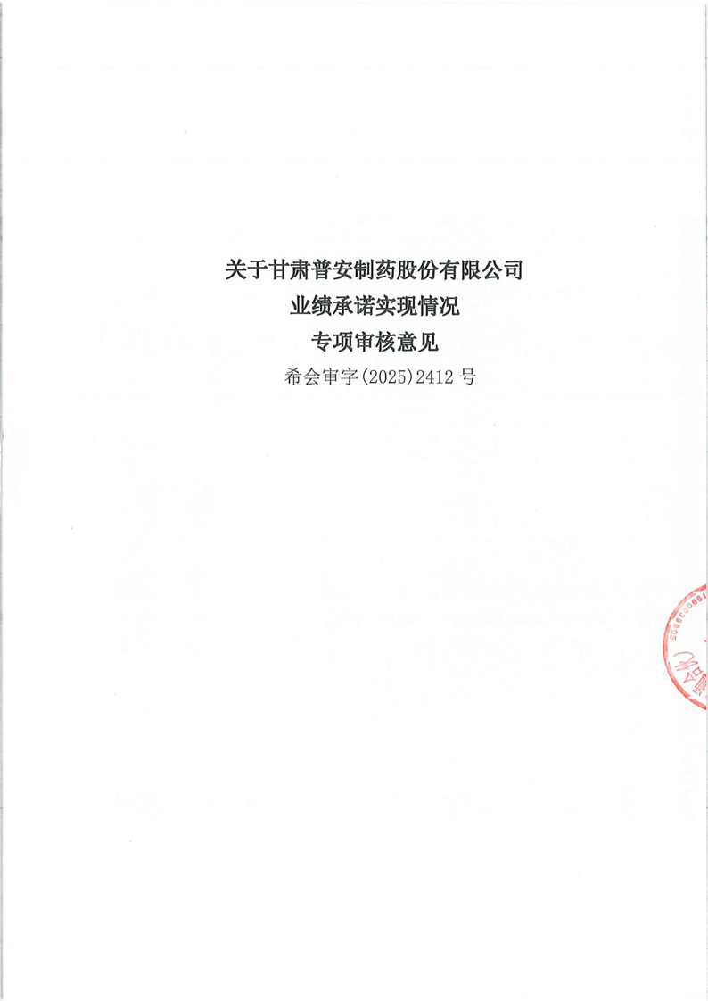 關于甘肅普安制藥股份有限公司業績承諾實現情況專項審核意見
